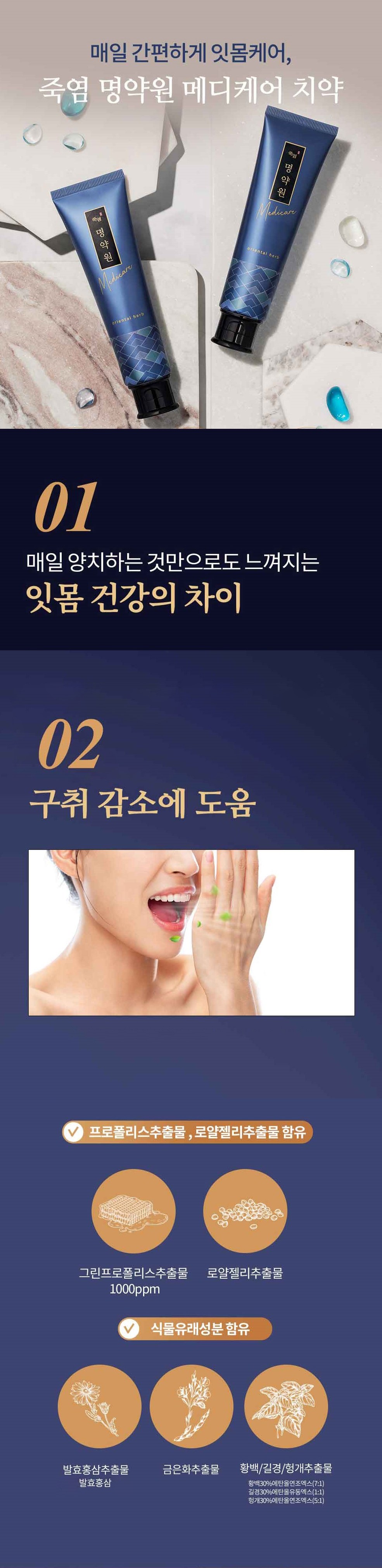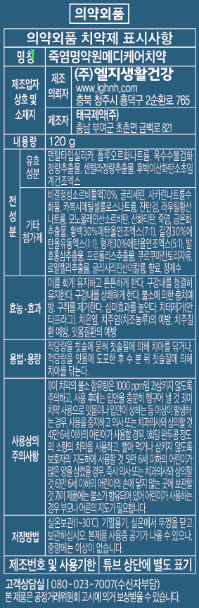 | 품명 및 모델명 | 죽염 명약원 메디케어 치약 | 인증/허가 사항 | 컨텐츠 참조 |