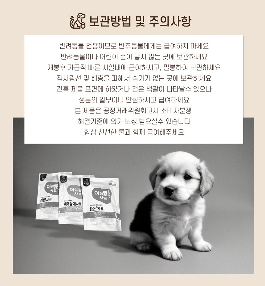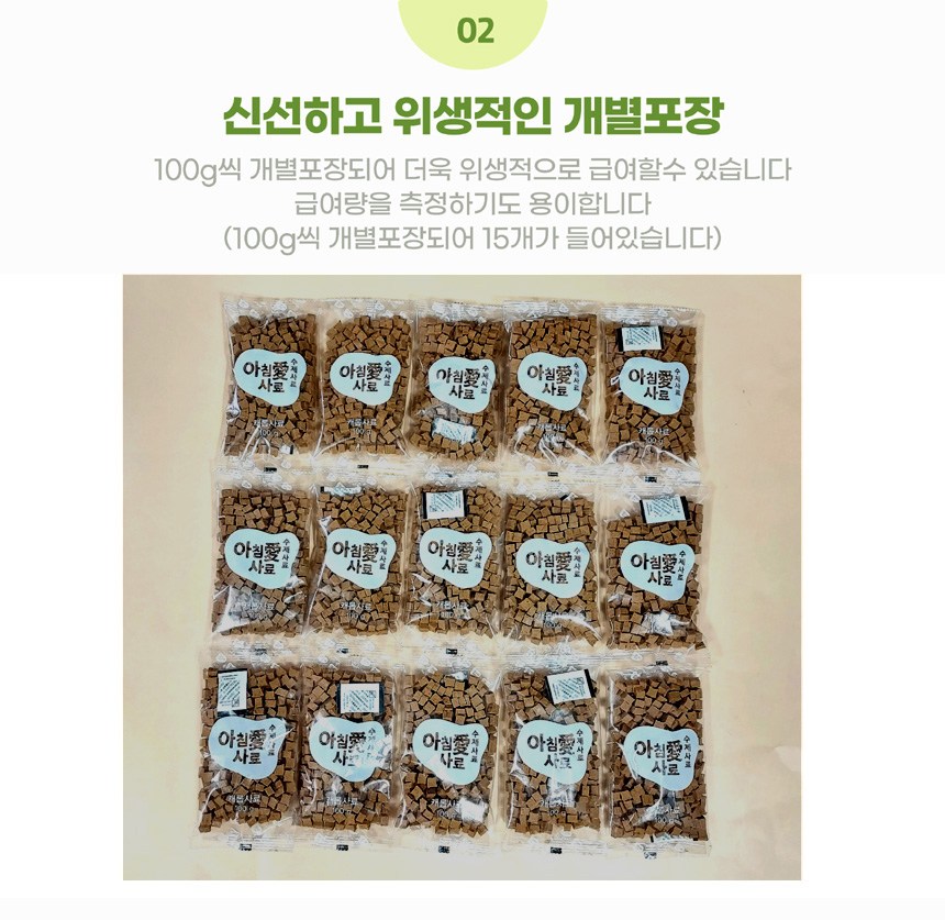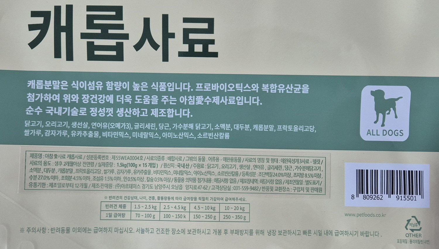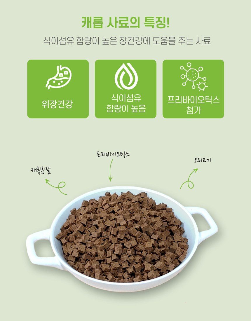 | 품명 및 모델명 | 아침愛사료 캐롭사료 | 인증/허가 사항 | 사료관리법에 따른 성분등록번호 : 컨텐츠 참조 |