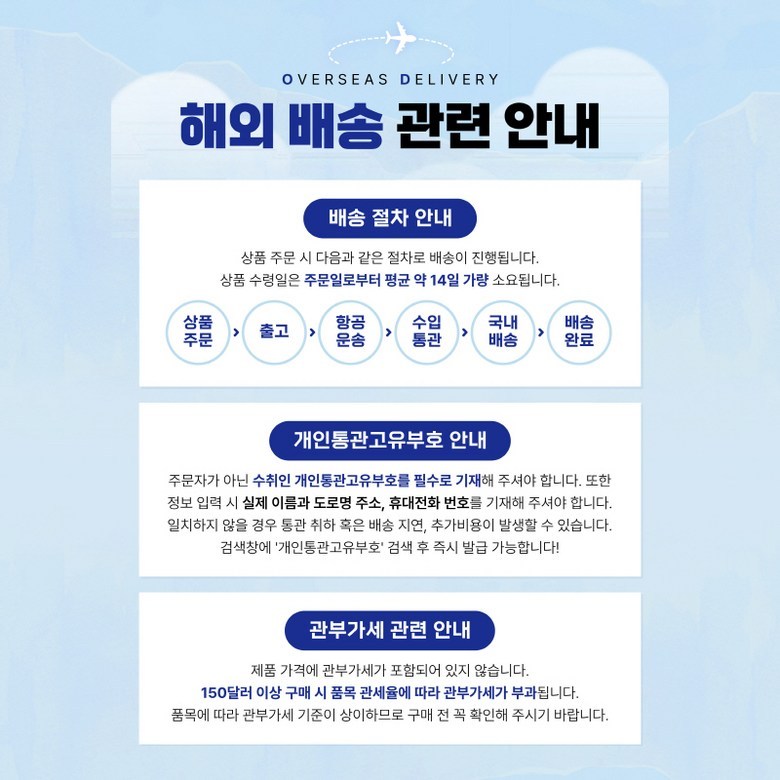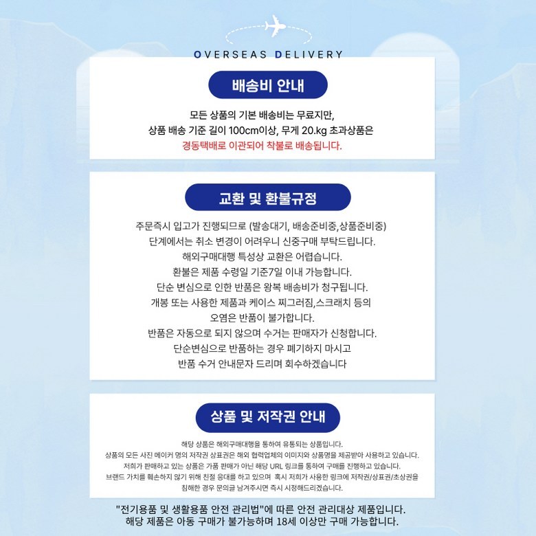 | 배송방법 | 해외직구 | 배송비 | 무료배송 · 도서산간 추가 배송비 - 제주 지역: 3,000원 - 도서산간 지역: 3,000원 |