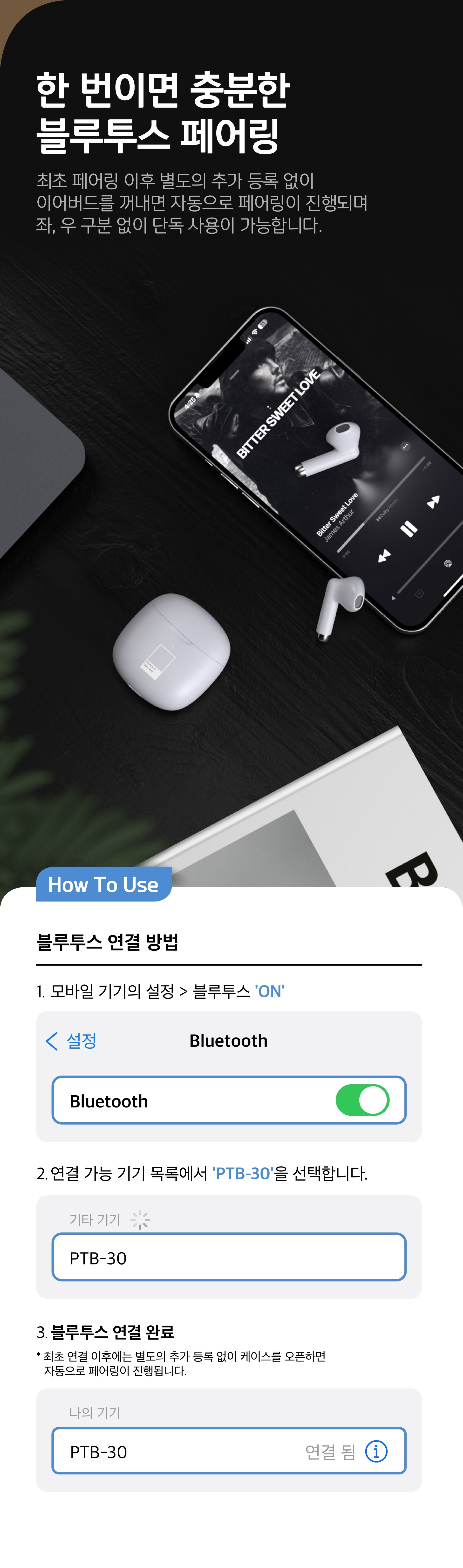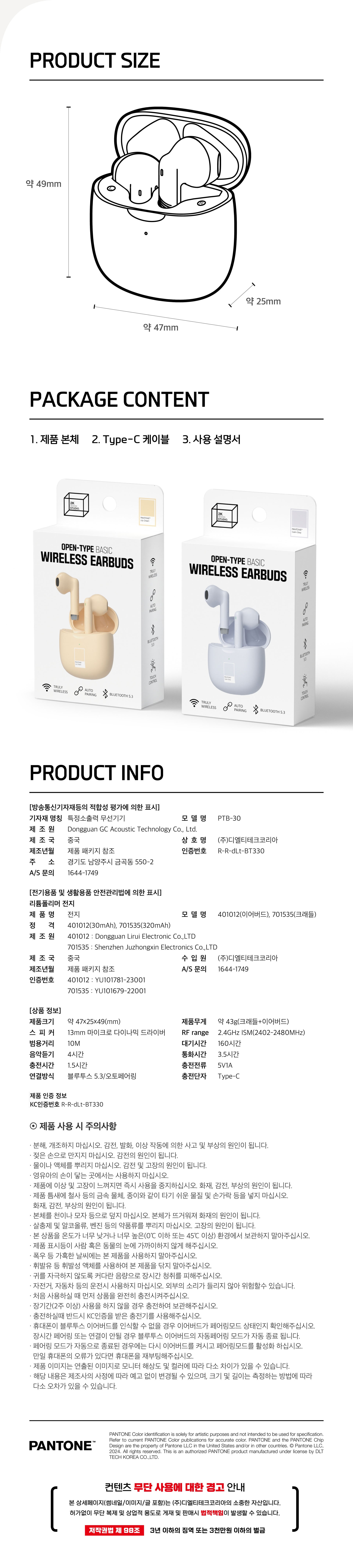 | 품명 및 모델명 | 팬톤 미니 무선 오픈형 블루투스 5.3 이어폰 / PTB-30 | KC 인증정보 | 본품 : R-R-dLt-BT330, 내장배터리(이어버드) : YU101781-23001, 내장배터리(크래들) : YU101679-22001 |