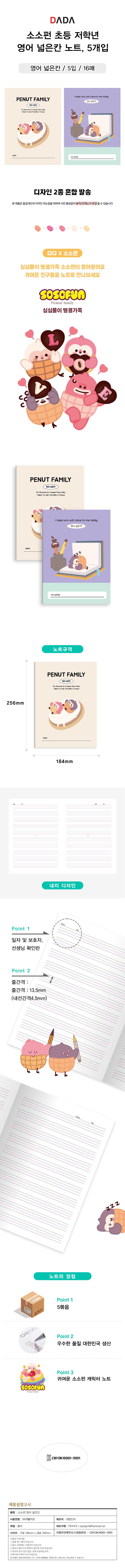 | 품명 및 모델명 | 다다 소소펀 초등 저학년 영어 넓은칸 노트 | KC 인증정보 | CB113K10001-2001 |