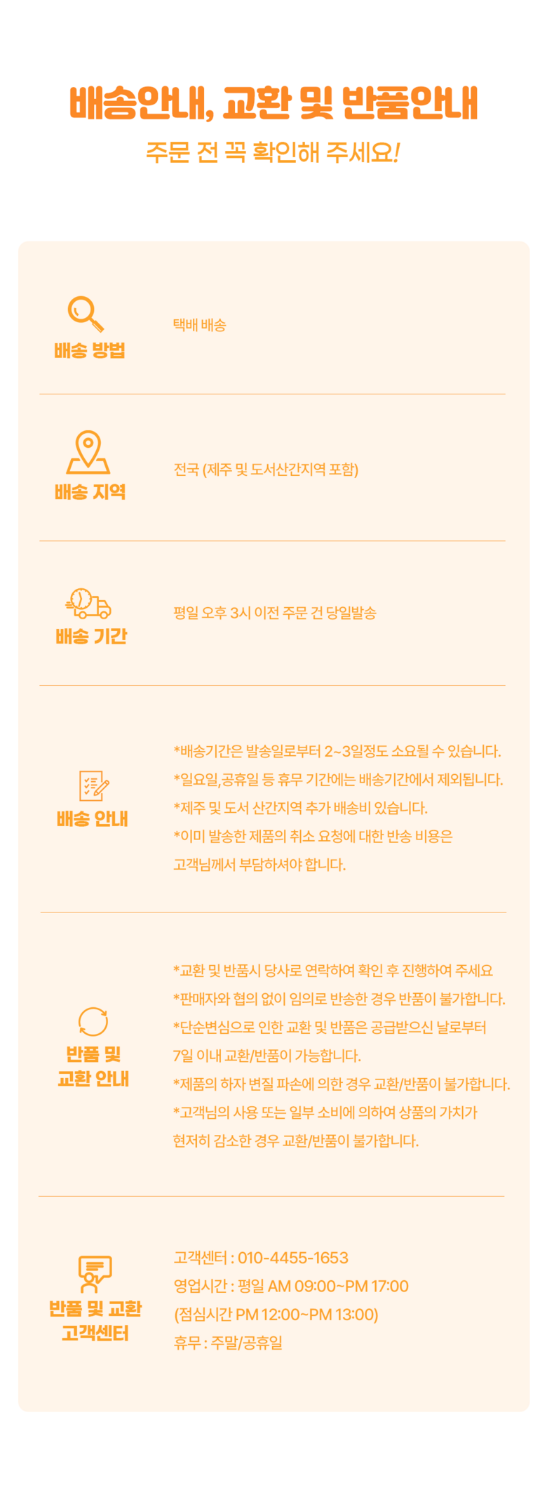 - ㆍ모니터 해상도의 차이로 인해 색상이나 이미지가 실제와 달라, 고객이 단순 변심으로 교환/반품을 무료로 요청하는 경우