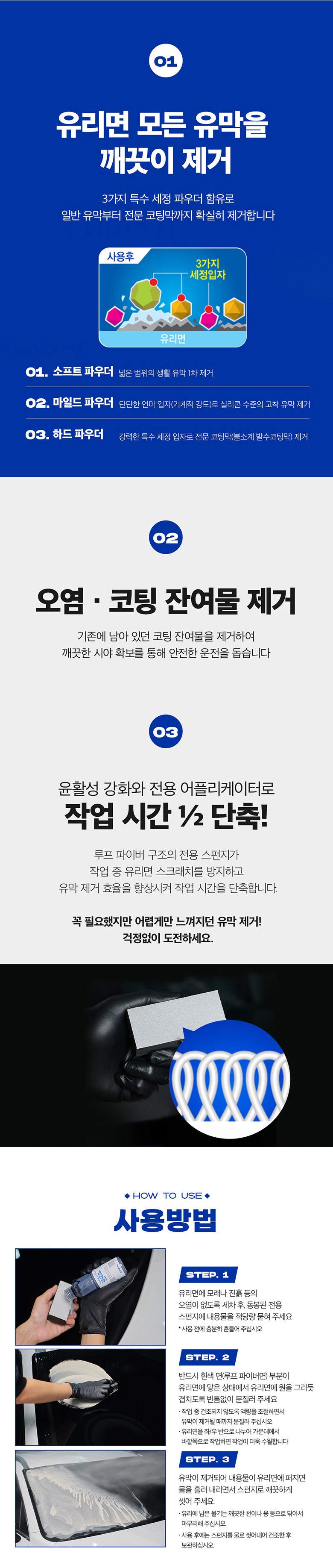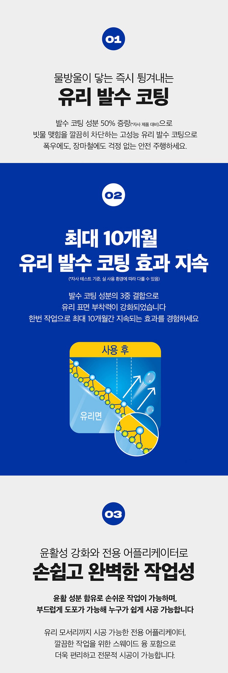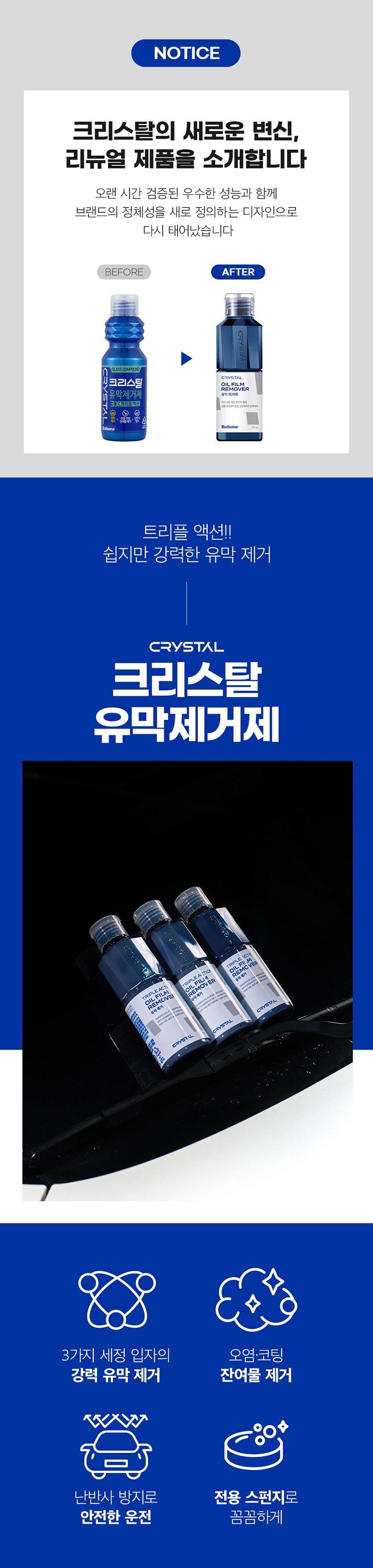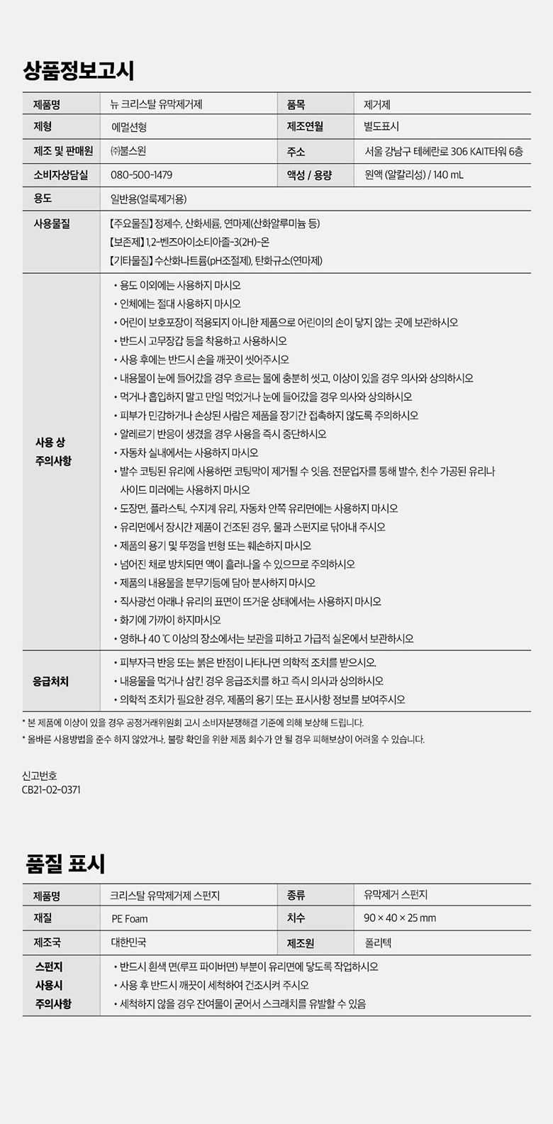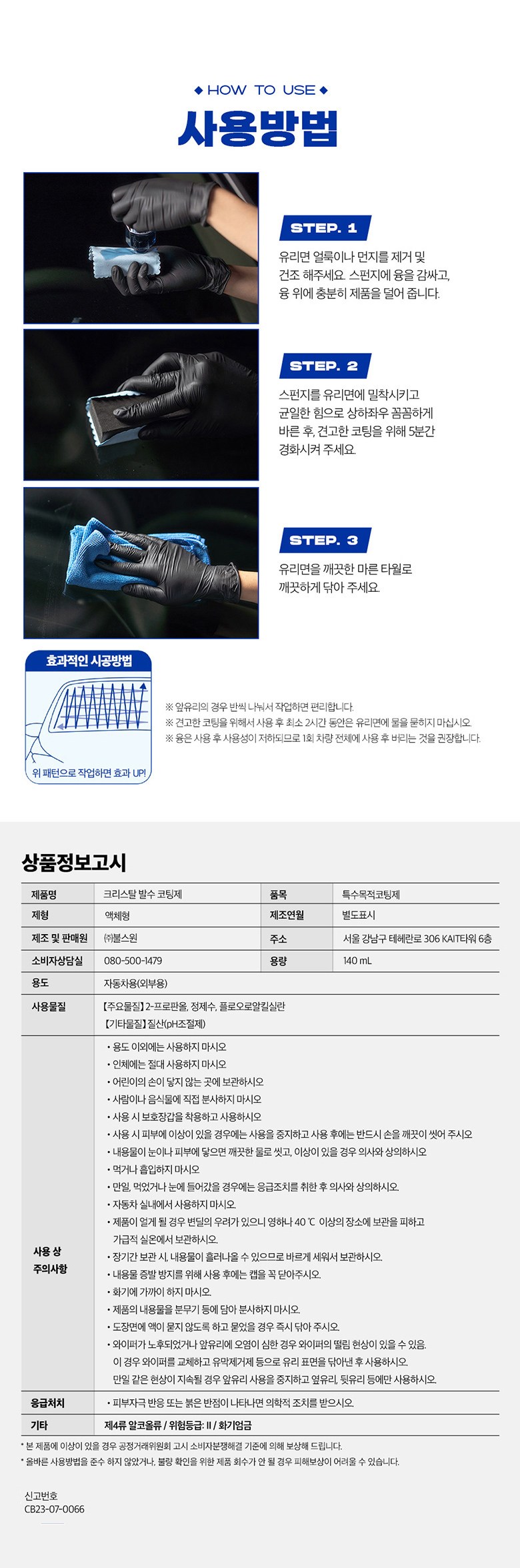 | 품목 및 제품명 | [발수코팅제] 특수목적코팅제 / 크리스탈 발수코팅제 [유막제거제] 제거제 / 뉴 크리스탈 유막제거제 | 용도(표백제의 경우 계열을 함께표시) 및 제형 | [발수코팅제] 자동차용-외부용 / 비분사형-액체형 [유막제거제] 일반용-얼룩제거용,일반용-기타제거용-유리물때제거용,자동차용-외부용-유막제거용 / 비분사형-에멀션형 |
