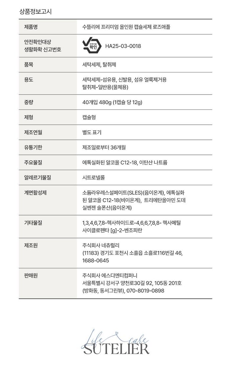 | 품목 및 제품명 | 상품 상세페이지 참조 | 용도(표백제의 경우 계열을 함께표시) 및 제형 | 상품 상세페이지 참조 |