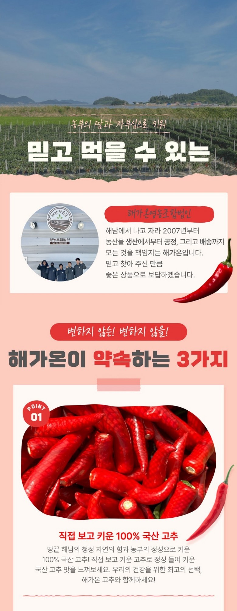 상호/대표자 | 해가온영농조합법인 / 조현숙 | 사업장 소재지 | 전라남도 해남군 북평면 땅끝해안로 3283-12 공장 |