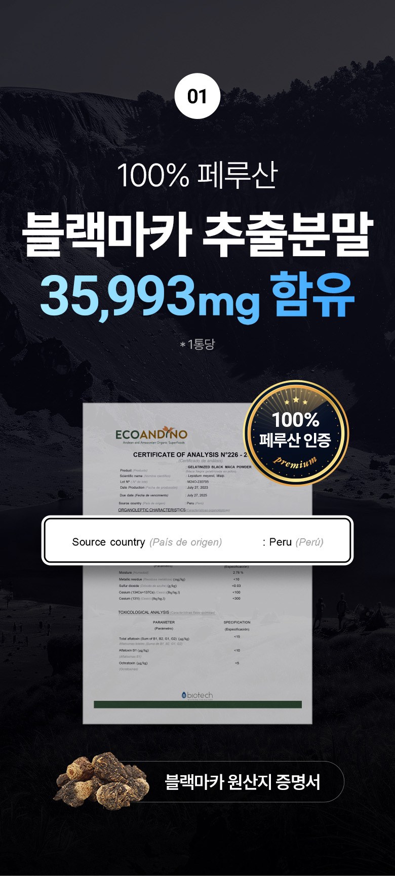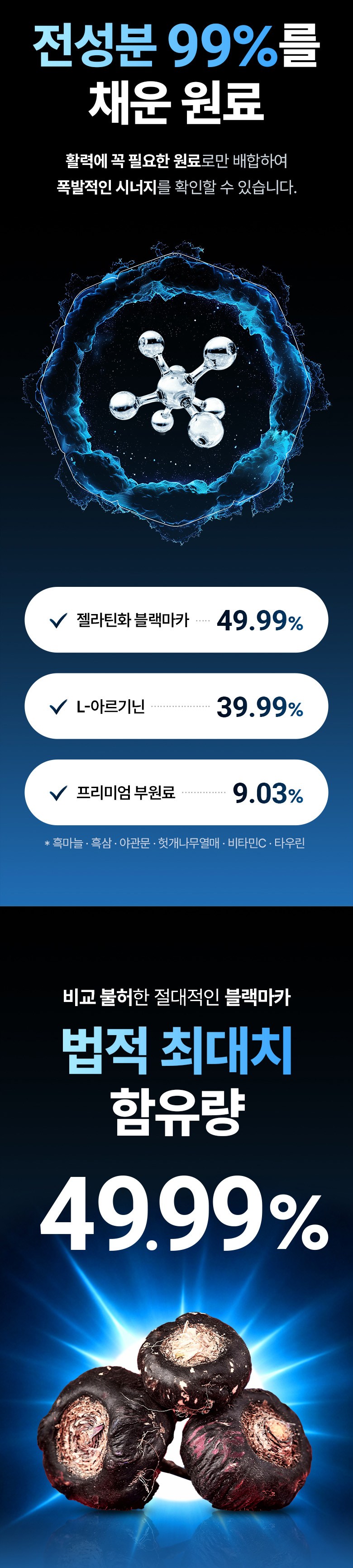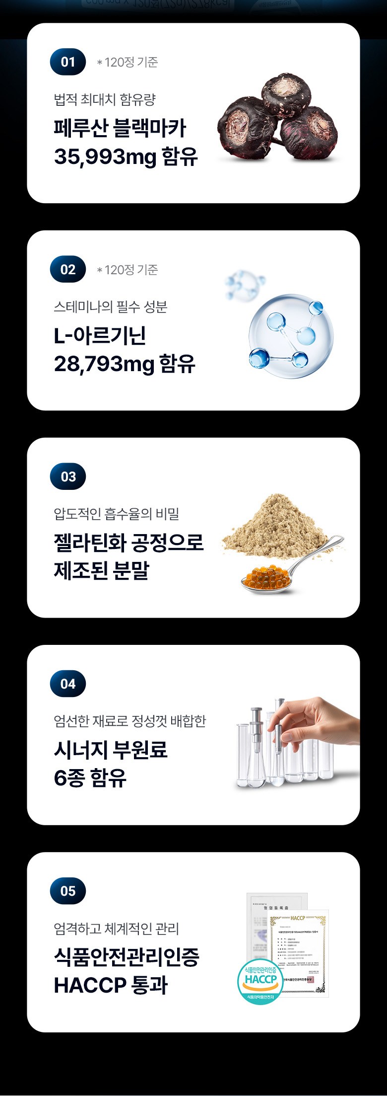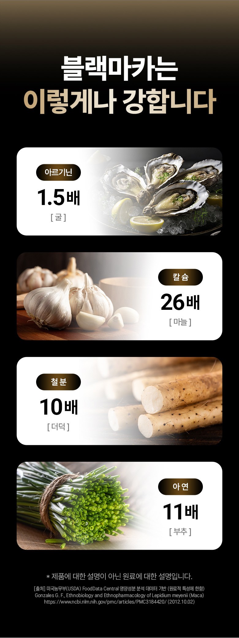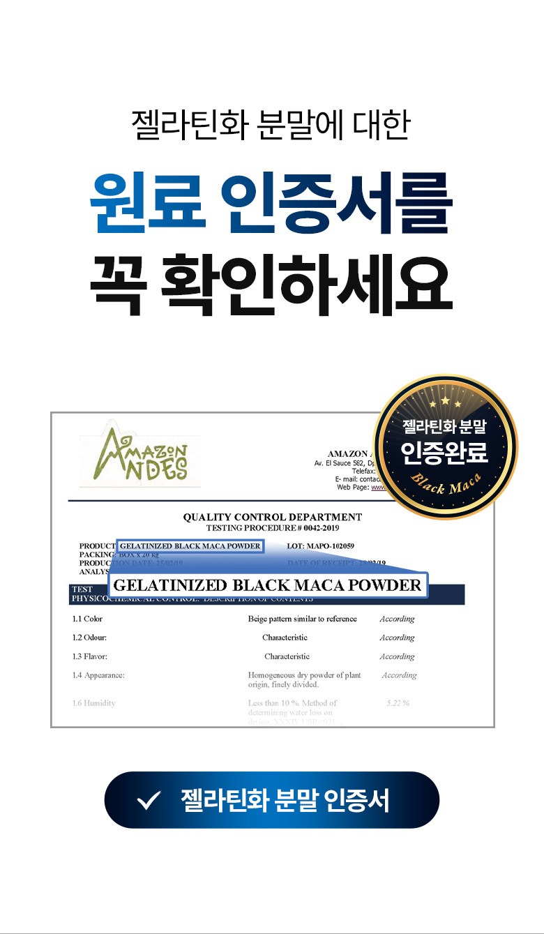 | 원료명 및 함량 | 블랙마카분말(페루산),L-아르지닌(중국산),흑마늘농축분말(국산),흑삼분말(국산),비수리(야관문)추출분말(국산),비타민C,산화아연,스테아린산마그네슘,이산화규소,우유,대두함유 | 영양정보 | 블랙마카분말(페루산),L-아르지닌(중국산),흑마늘농축분말(국산),흑삼분말(국산),비수리(야관문)추출분말(국산),비타민C,산화아연,스테아린산마그네슘,이산화규소,우유,대두함유 |