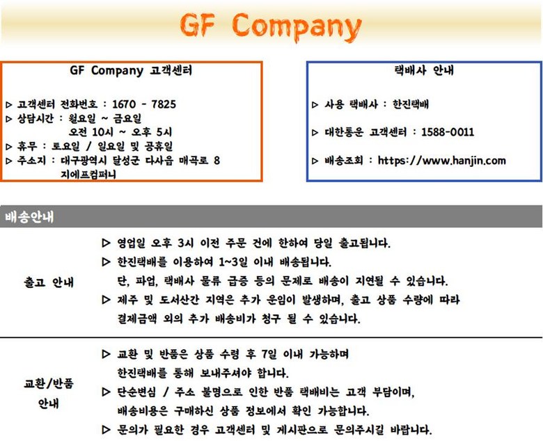 상호/대표자 | 지에프컴퍼니(GF COMPANY) / 현선진 | 사업장 소재지 | 대구광역시 남구 명덕로8길 14 1층 지에프컴퍼니 |