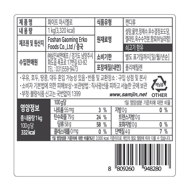 | 포장단위별 내용물의 용량(중량), 수량 | 1kg x 2개 | 원재료명 및 함량 | 컨텐츠 참조 |
