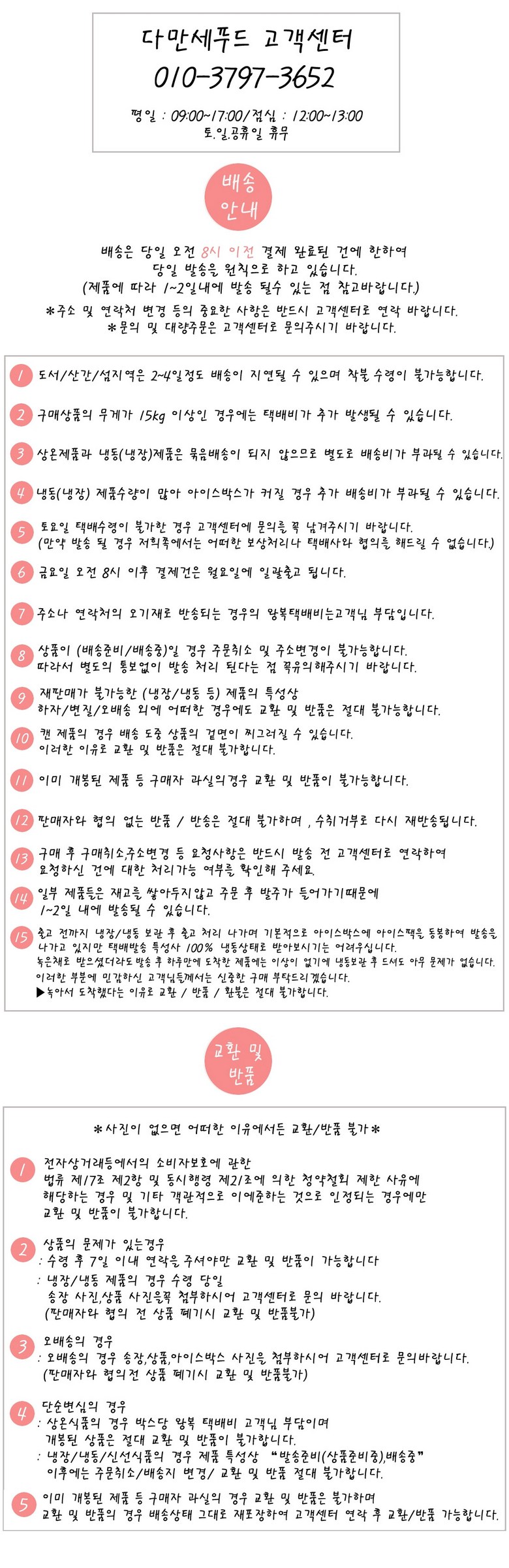 | 배송방법 | 신선/냉장/냉동 | 배송비 | 무료배송 · 도서산간 추가 배송비 - 제주 지역: 3,000원 - 도서산간 지역: 7,000원 |