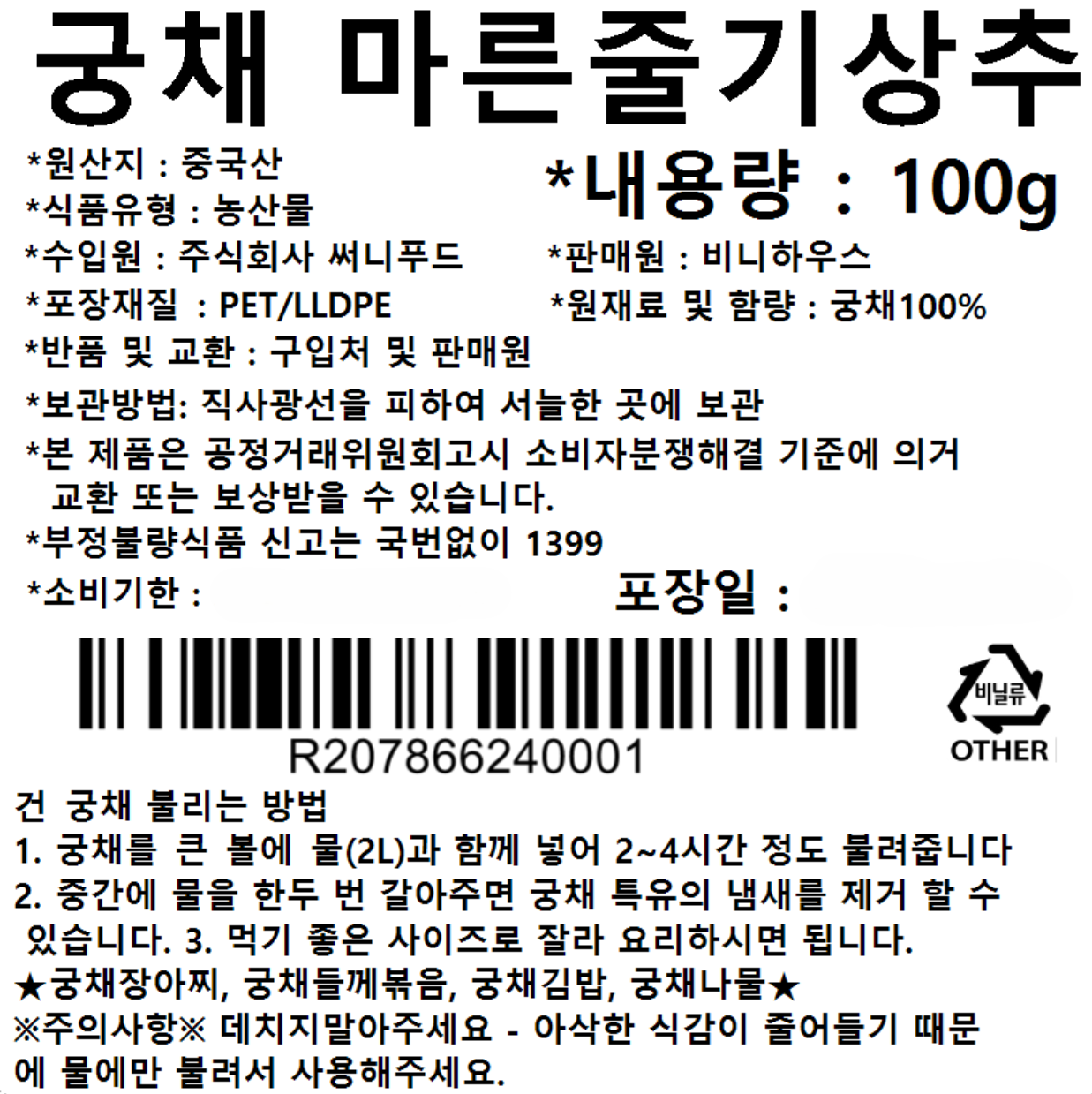 | 품목 또는 명칭 | 마른줄기상추(궁채) | 포장단위별 내용물의 용량(중량),수량,크기 | 컨텐츠 참조 |