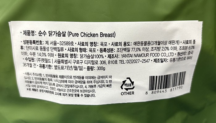 | 품명 및 모델명 | 순수 닭가슴살 | 인증/허가 사항 | 사료관리법에 따른 성분등록번호 : 컨텐츠 참조 |