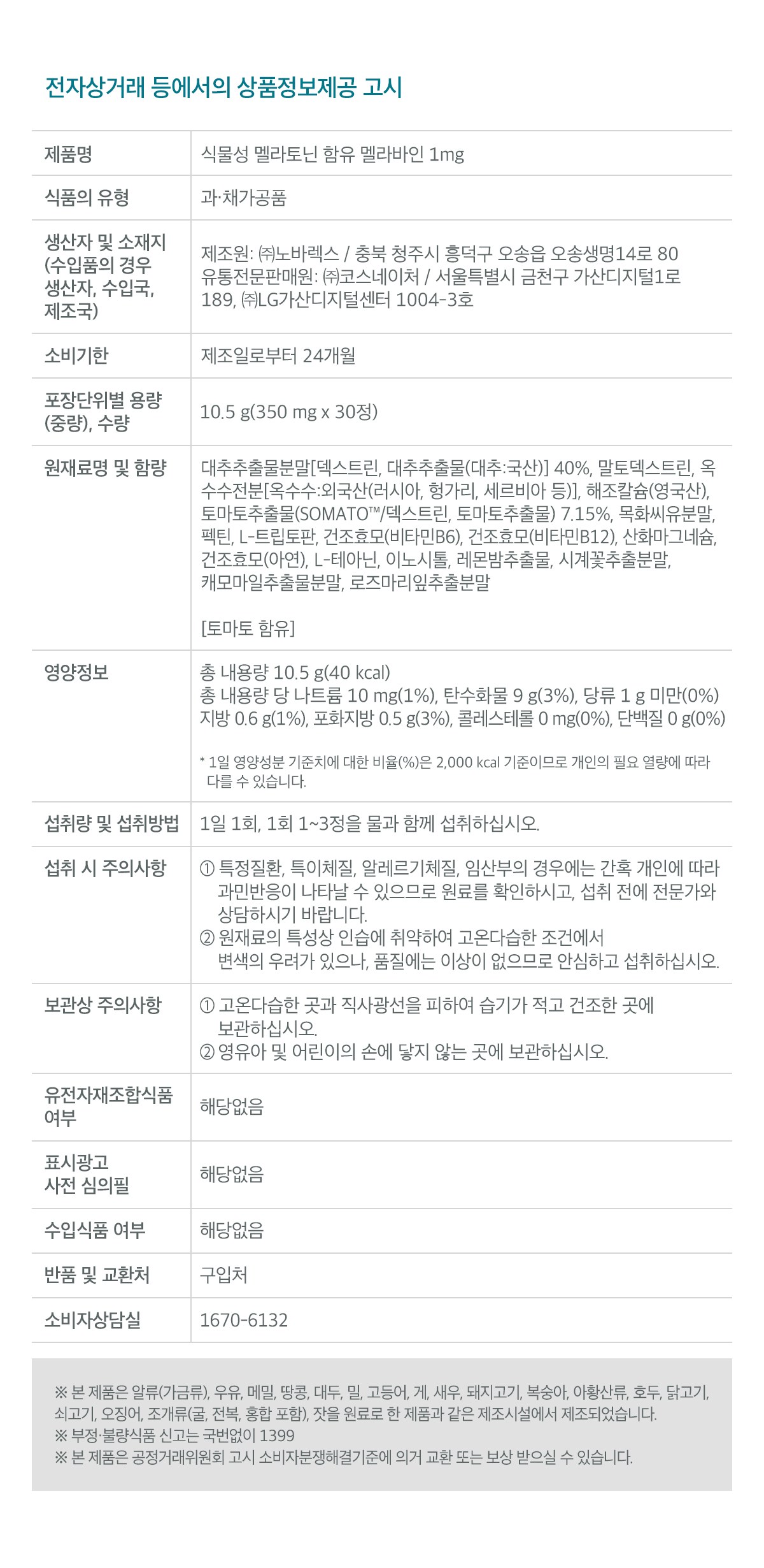 | 제품명 | 식물성 멜라토닌 함유 멜라바인 1mg | 식품의 유형 | 컨텐츠 참조 |