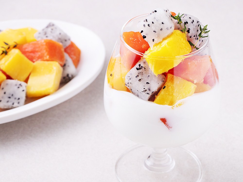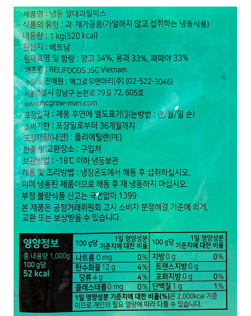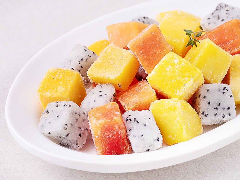 잘 익은 망고, 용과, 파파야를 차갑게 얼렸어요. 망고와 파파야는 쫀득하게, 용과는 부드럽게 씹히며 먹는 재미를 더하지요. 살짝 해동해 그대로 먹어도 맛있고, 스무디로 만들어도 좋아요. 취향 따라, 입맛 따라 다채롭게 냉동 열대과일 믹스의 달콤함을 만끽해보세요.