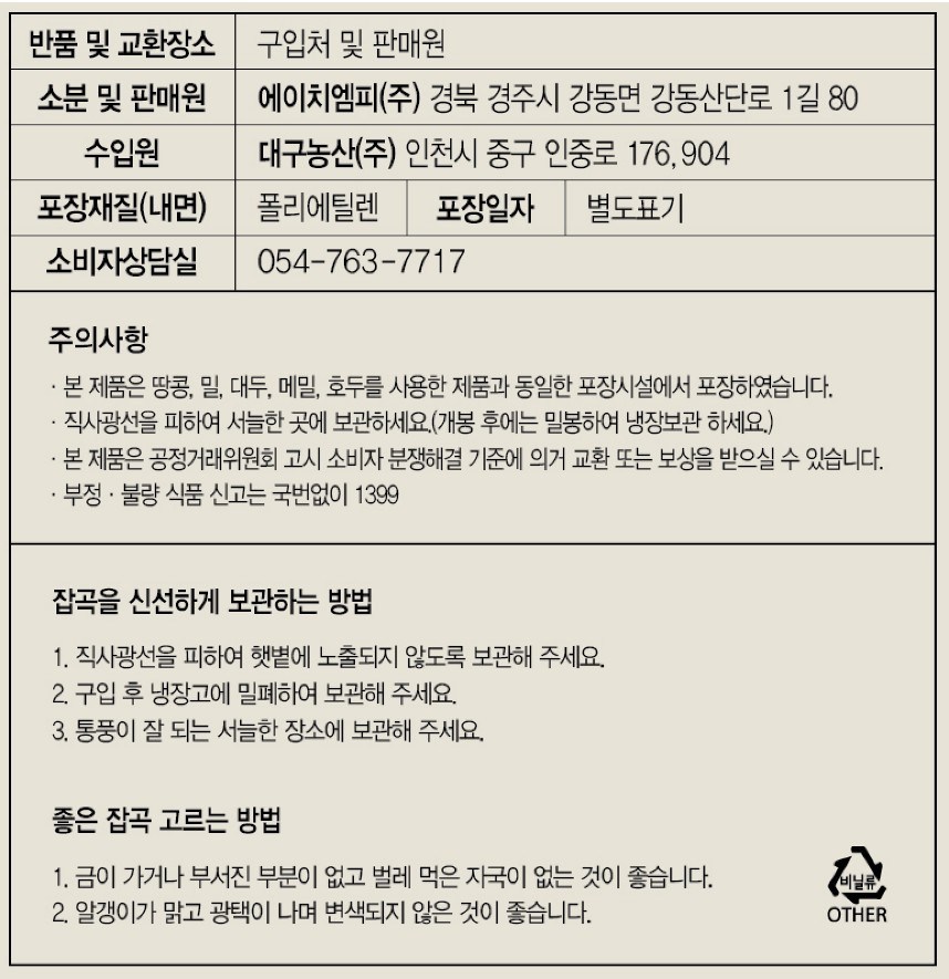 | 제조연월일, 소비기한 또는 품질유지기한 | 제조년월일 : 2025년 12월 19일 이후인 제조상품 | 세부 품목군별 표시사항 | 농수산물 : 유전자변형(해당 없음) / 지리적 표시사항(해당 없음) |