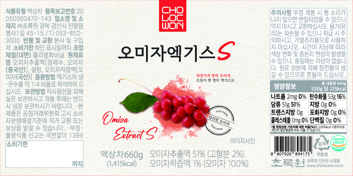 | 제품명 | 오미자엑기스S | 식품의 유형 | 컨텐츠 참조 |
