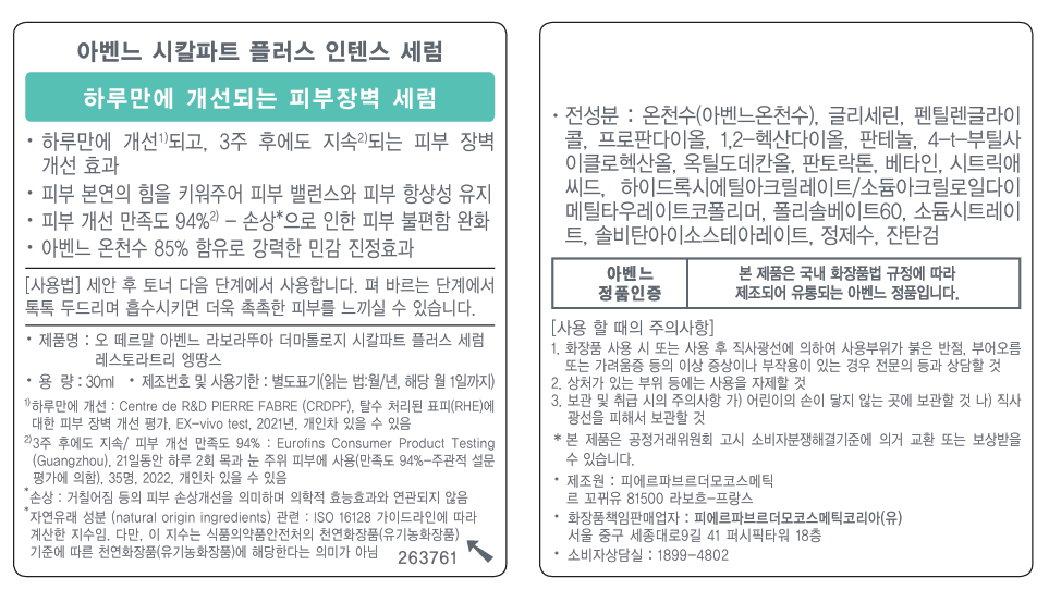 | 화장품제조업자, 화장품책임판매업자 및 맞춤형화장품판매업자 | 컨텐츠 참조 | 제조국 | 프랑스 |