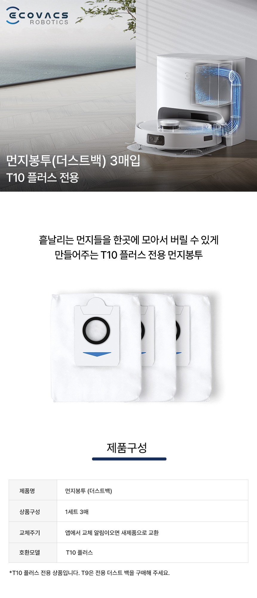 | 품명 및 모델명 | 에코백스 일반 더스트백 3매입 (T10플러스 전용) | 인증/허가 사항 | 해당없음 |