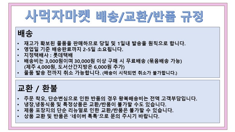 | 교환/반품 비용 (왕복비용) | 3,000원 - 단, 고객 변심의 경우에만 발생 - 도서산간 지역 배송불가 |