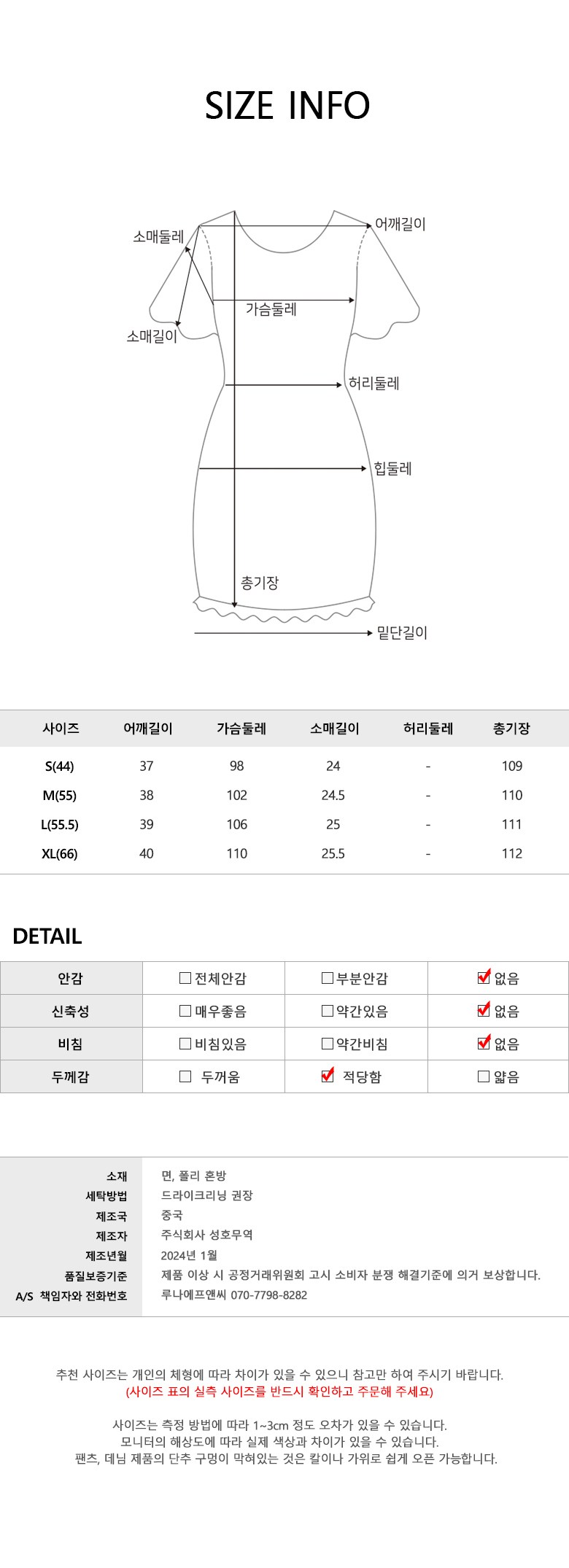 - 소매 길이: 반소매(어깨~팔꿈치 길이)
