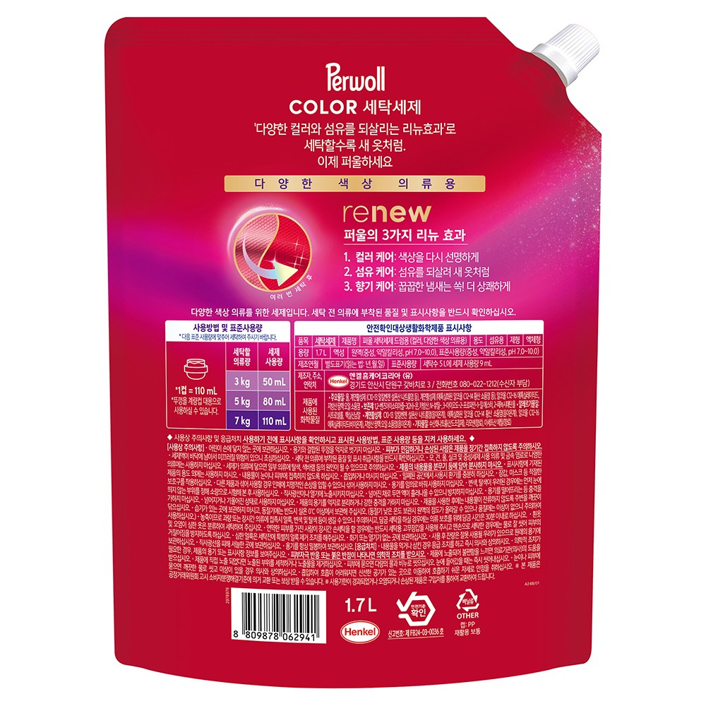 | 품목 및 제품명 | 세탁세제 / 퍼울 세탁세제 드럼용 (컬러, 다양한 색상 의류용) | 용도(표백제의 경우 계열을 함께표시) 및 제형 | 섬유용 / 액체형 |