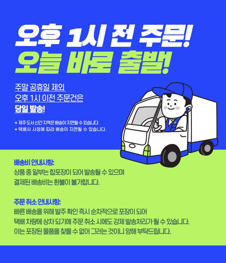 | 배송기간 | ㆍ도서산간 지역 등은 배송에 3-5일이 더 소요될 수 있습니다. - 천재지변, 물량 수급 변동 등 예외적인 사유 발생 시, 다소 지연될 수 있는 점 양해 부탁드립니다. | ||