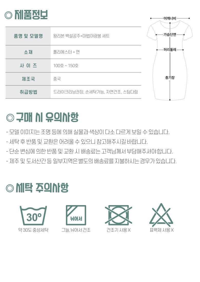 | 제조국 | 드레스 :중국 / 악세사리: 중국/ 야광봉: 중국 | 세탁방법 및 취급시 주의사항 | 드레스: 경고!3세 미만의 어린이는 사용할 수 없음, 경고!화기로부터 멀리 할 것, 손세탁권장, 드라이크리닝권장, 표백제사용금지 / 악세사리: 경고!3세 미만의 어린이는 사용할 수 없음, 경고!화기로부터 멀리 할 것, 입에 넣지 마시오, 눈에 접촉 금지, 부러지기 쉬우니 과한 힘을 가하지 마시오 / 야광봉: 파손시 야광액이 묻었을 경우 지워지지 않을 수 있음, 어린이 사용시 못먹도록 보호자의 지도 필요, 여름철은 발광 지속시간이 단축됨. |