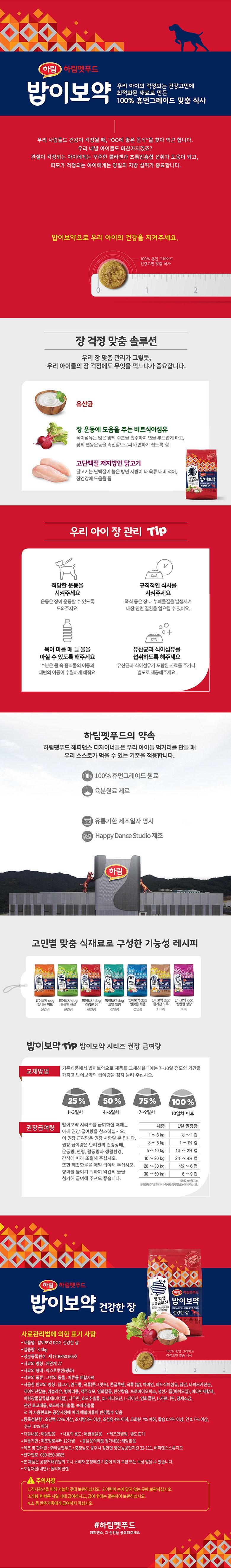 | 품명 및 모델명 | 밥이보약 DOG 건강한 장 | 인증/허가 사항 | 사료관리법에 따른 성분등록번호 : 컨텐츠 참조 |