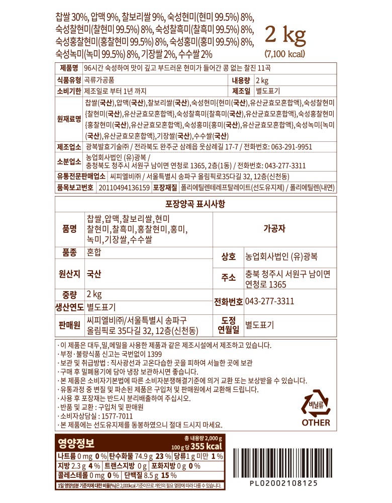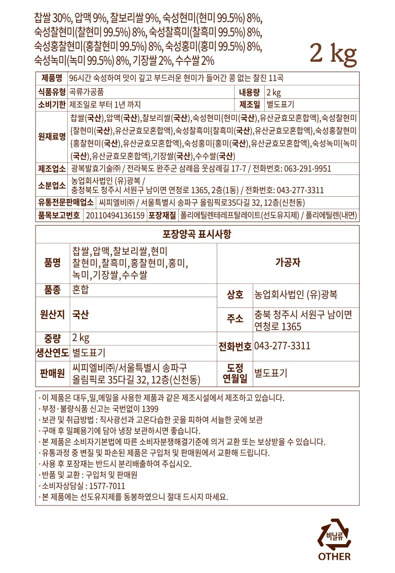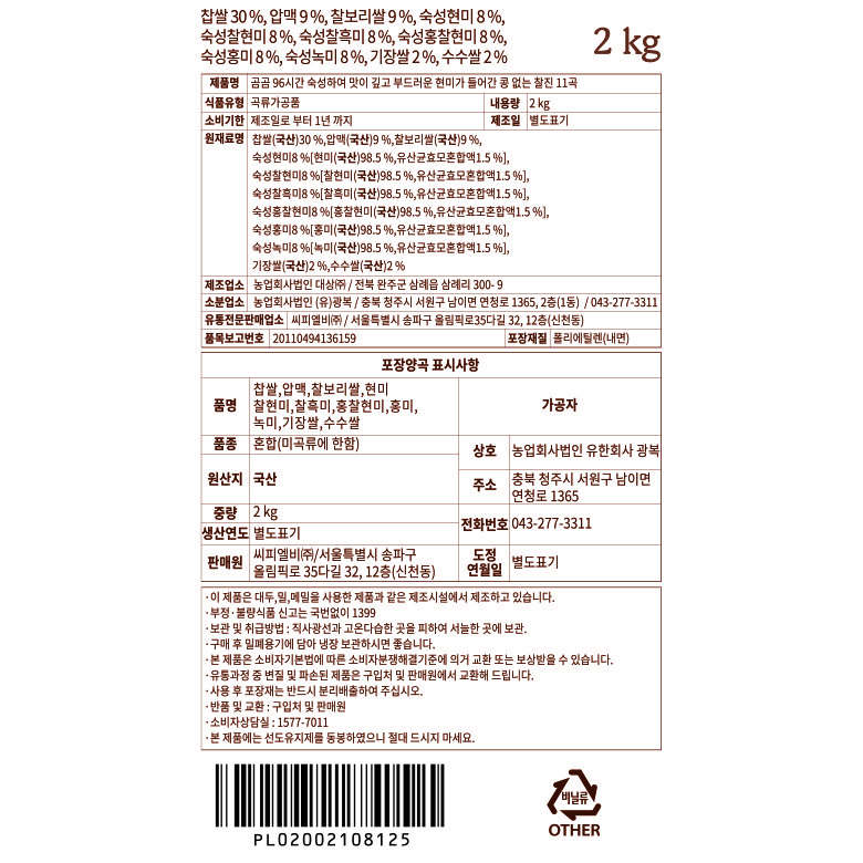 | 포장단위별 내용물의 용량(중량), 수량 | 2kg x 1개 | 원재료명 및 함량 | 컨텐츠 참조 |