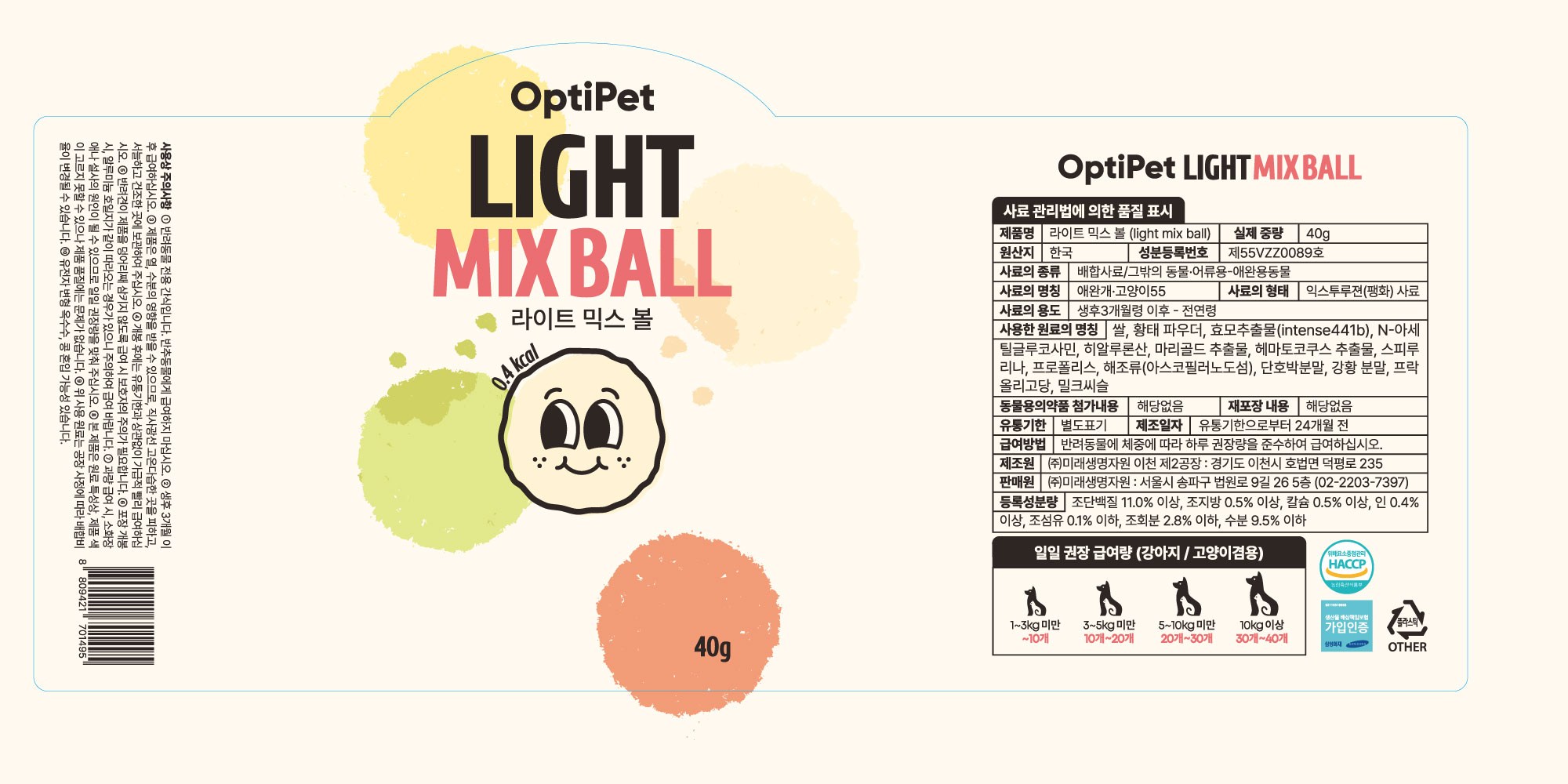 | 품명 및 모델명 | 라이트 믹스 볼 | 인증/허가 사항 | 사료관리법에 따른 성분등록번호 : 컨텐츠 참조 |