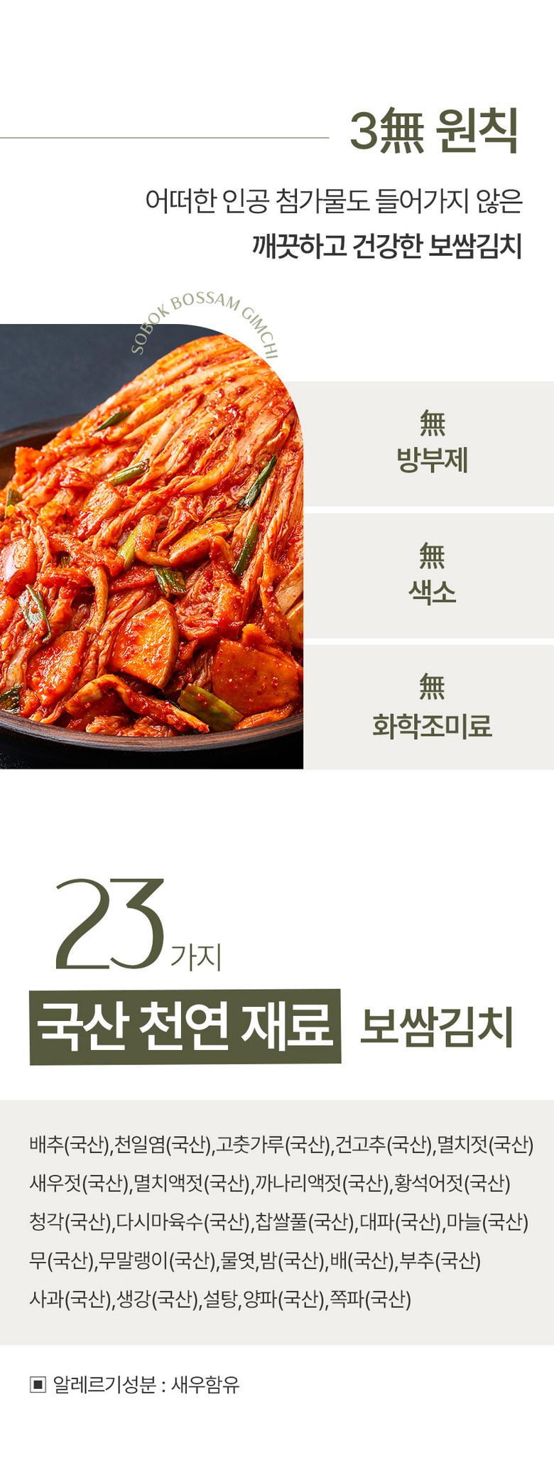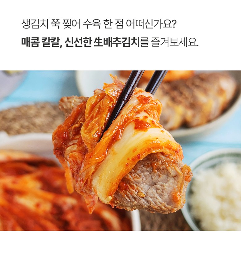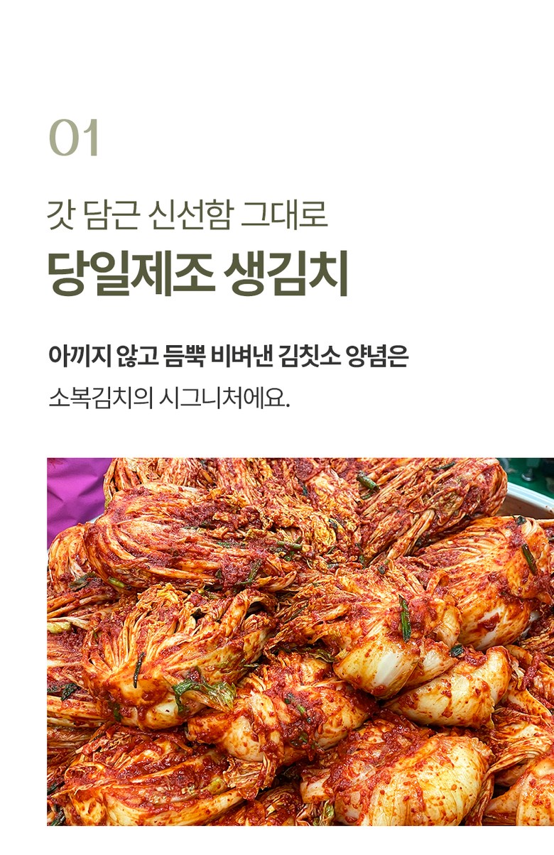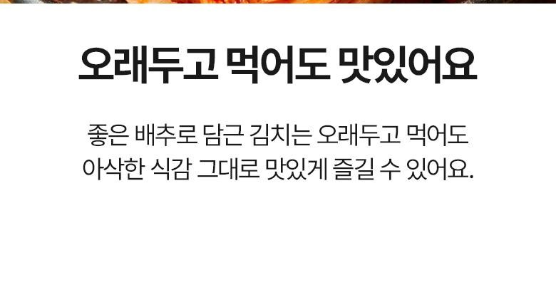 | 포장단위별 내용물의 용량(중량), 수량 | 2kg, 3kg, 5kg / 1개 | 원재료명 및 함량 | 절임배추71%[배추98%(국산),천일염(국산)],고춧가루(국산),건고추(국산),멸치젓(국산),새우젓(국산),멸치액젓(국산),까나리액젓(국산),황석어젓(국산),청각(국산),다시마육수(국산),찹쌀풀(국산),대파(국산),마늘(국산),무(국산),무말랭이(국산),물엿,밤다이스(국산),배(국산),부추(국산),사과(국산),생강(국산),설탕,양파(국산),쪽파(국산)▣알레르기성분:새우함유 |