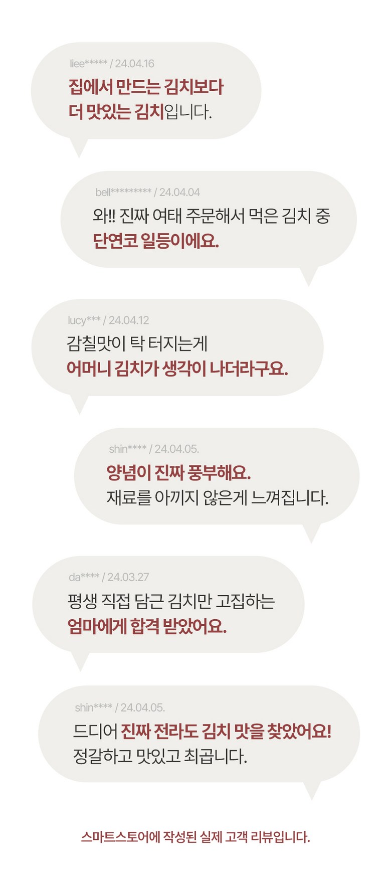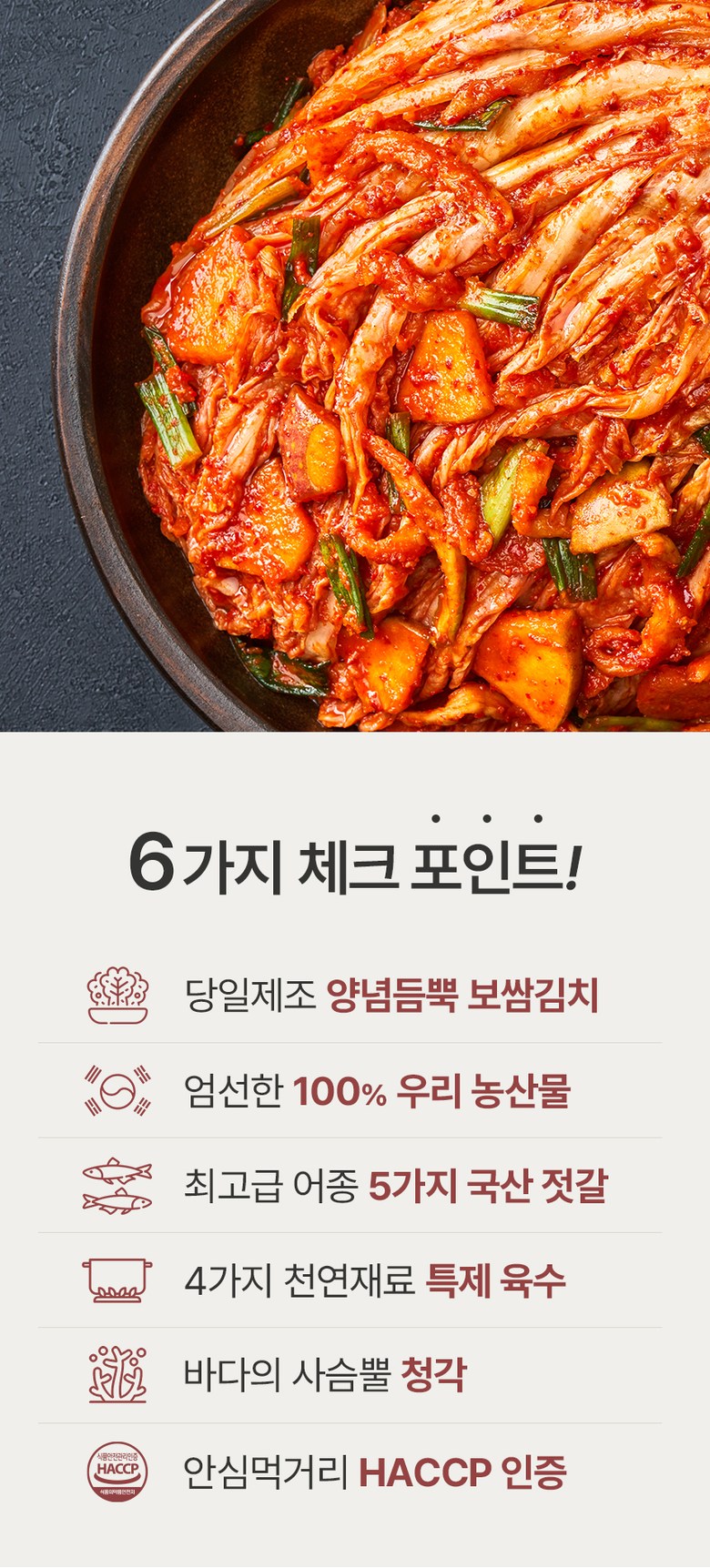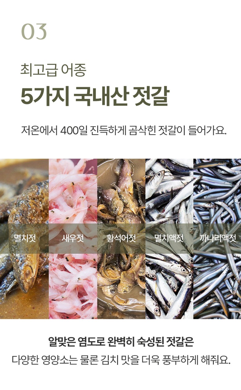 | 포장단위별 내용물의 용량(중량), 수량 | 2kg, 3kg, 5kg / 1개 | 원재료명 및 함량 | 절임배추71%[배추98%(국산),천일염(국산)],고춧가루(국산),건고추(국산),멸치젓(국산),새우젓(국산),멸치액젓(국산),까나리액젓(국산),황석어젓(국산),청각(국산),다시마육수(국산),찹쌀풀(국산),대파(국산),마늘(국산),무(국산),무말랭이(국산),물엿,밤다이스(국산),배(국산),부추(국산),사과(국산),생강(국산),설탕,양파(국산),쪽파(국산)▣알레르기성분:새우함유 |