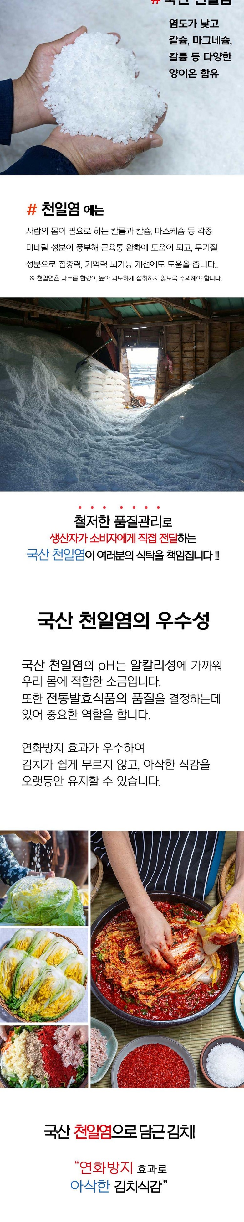 - 천일염은 감칠맛과 복합 풍미가 있어 김치·장류·절임에 적합합니다.
