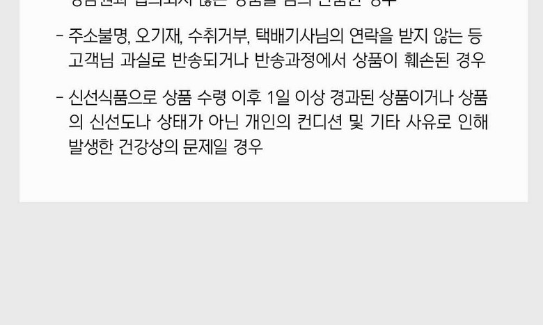 | 계절상품/식품/화장품 | ㆍ신선/냉장/냉동 상품의 단순변심의 경우 ㆍ뷰티 상품 이용 시 트러블(알러지, 붉은 반점, 가려움, 따가움)이 발생하는 경우, |