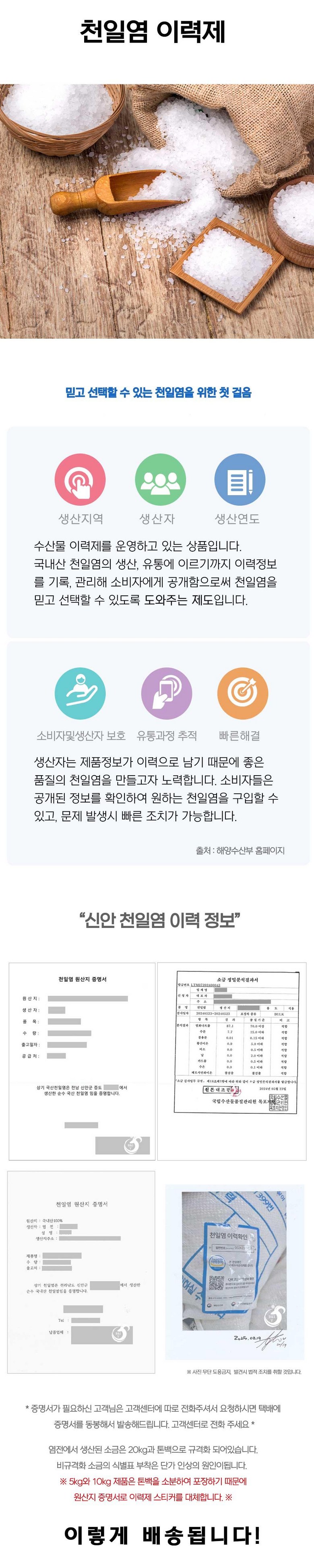 | 품목 또는 명칭 | 신안 굵은 천일염 소금 | 포장단위별 내용물의 용량(중량),수량,크기 | 상품 상세페이지 참조 |