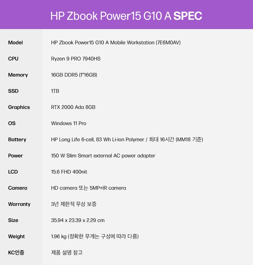 | 품명 및 모델명 | 노트북 / 모델명: HP Zbook Power15 G10 A Mobile Workstation (7E6M0AV) / 인증모델명: HP ZBook Power 15.6 inch G10 A | KC 인증정보 | 본품: XU100282-23177 / R-R-hpk-HSN-Q37C |