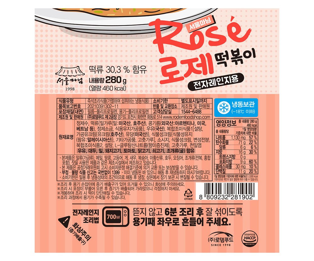 | 제품명 | 서울마님 즉석 로제떡볶이 | 식품의 유형 | 컨텐츠 참조 |