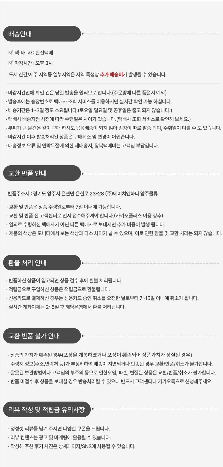 - ㆍ교환/반품에 관한 일반적인 사항은 판매자가 제시사항보다 관계법령이 우선합니다.