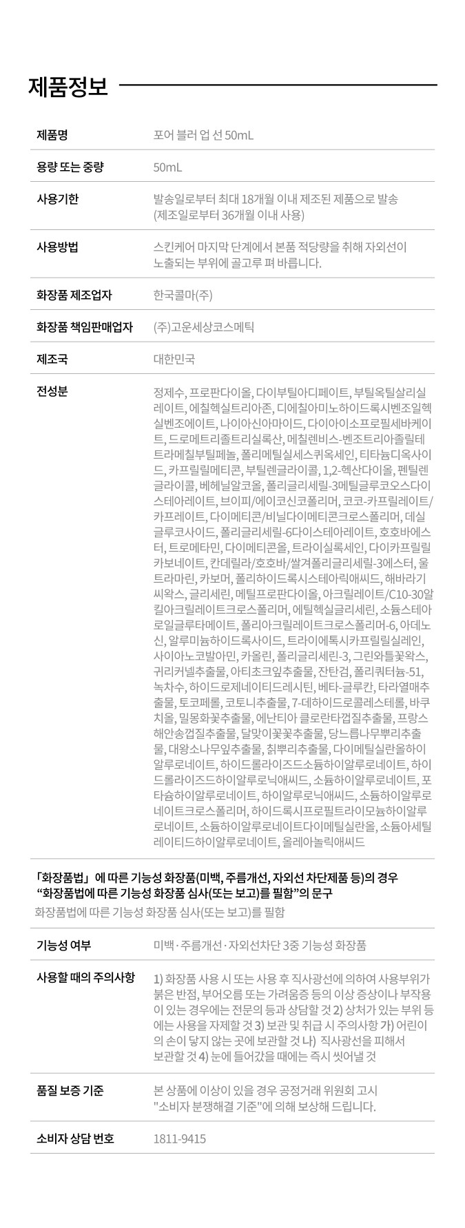 | 화장품제조업자, 화장품책임판매업자 및 맞춤형화장품판매업자 | 한국콜마(주)/(주)고운세상코스메틱 | 제조국 | 대한민국 |