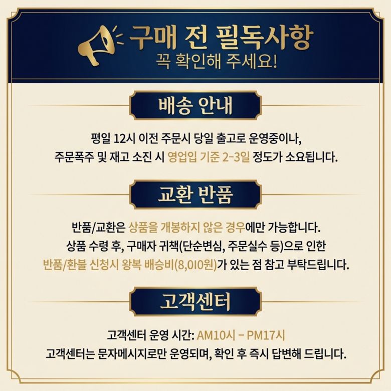 | 교환/반품 비용 (왕복비용) | 8,000원 - 단, 고객 변심의 경우에만 발생 - 도서산간 지역 배송불가 |