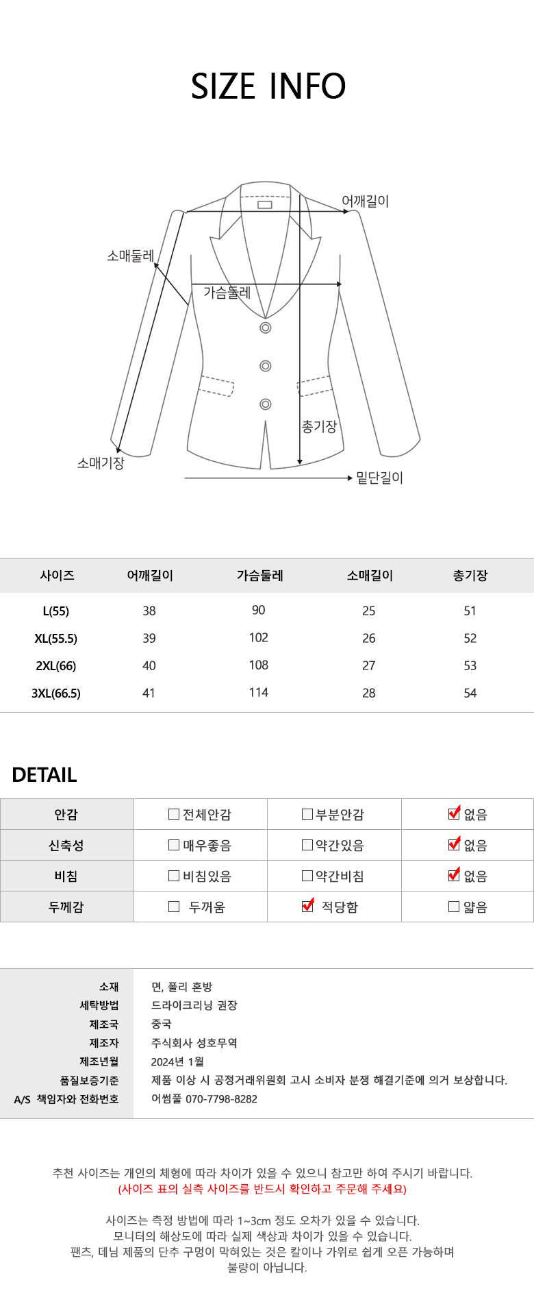 | 제조국 | 중국 | 세탁방법 및 취급시 주의사항 | 컨텐츠참조 |