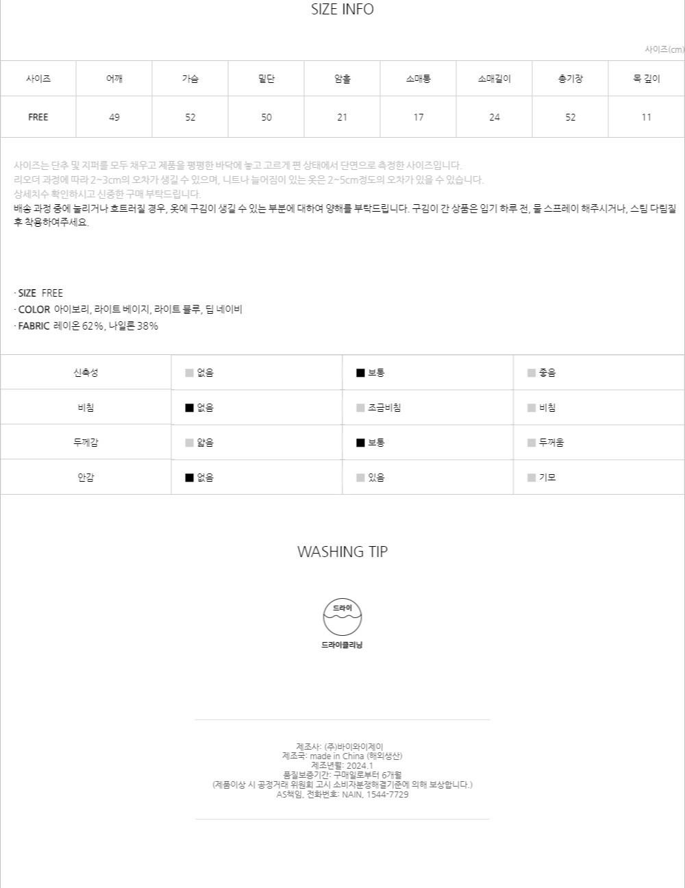 | 제조국 | 중국 | 세탁방법 및 취급시 주의사항 | 컨텐츠 참조 |