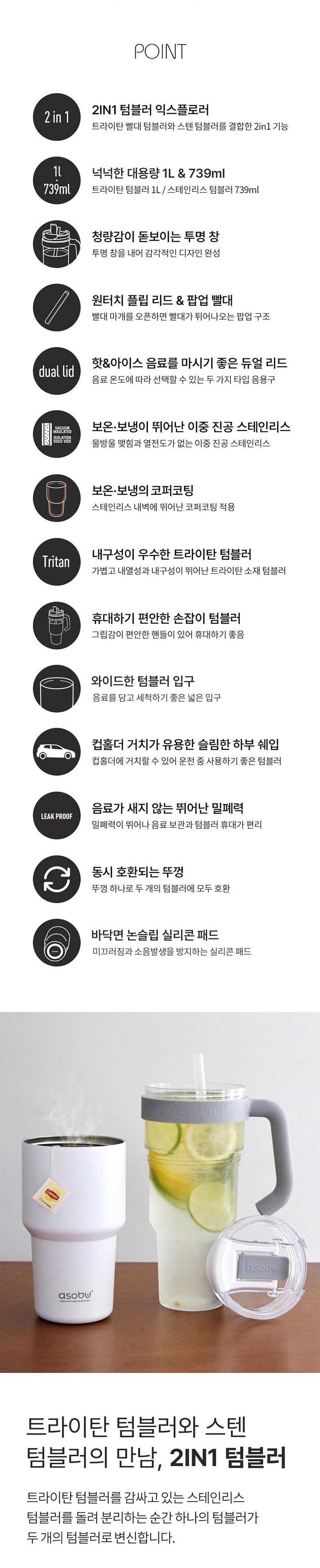 | 품명 및 모델명 | 아소부 보온보냉 손잡이텀블러 앤 진공스텐 빨대텀블러 익스플로러 | 재질 | 컨텐츠 참조 |