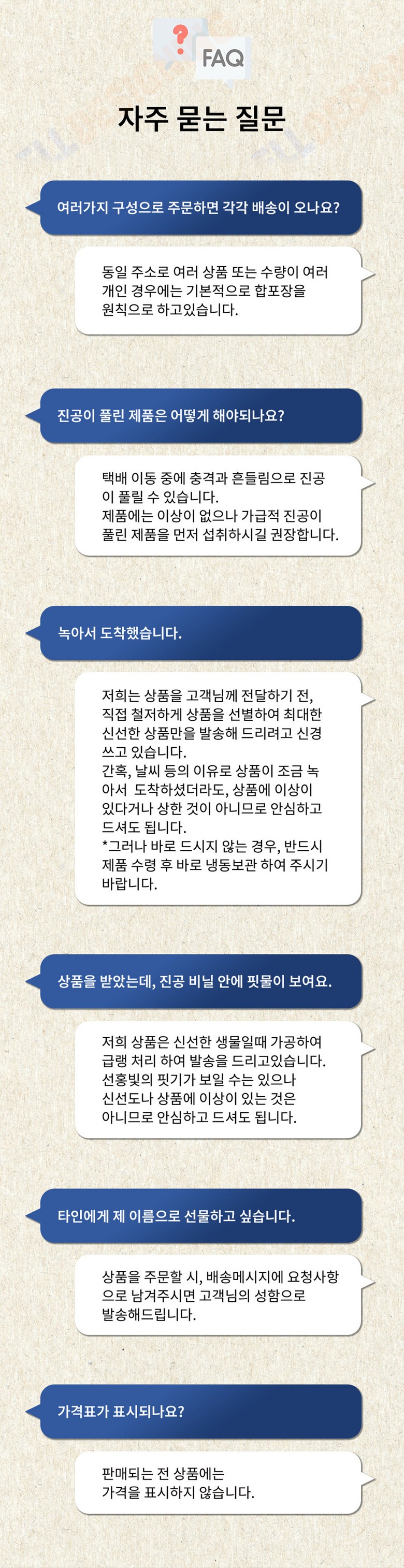 | 배송방법 | 신선/냉장/냉동 | 배송비 | 무료배송 - 도서산간 지역 배송불가 |