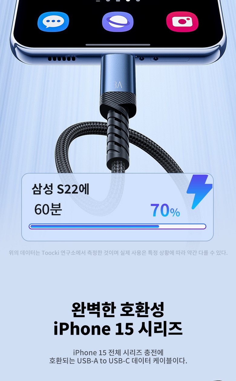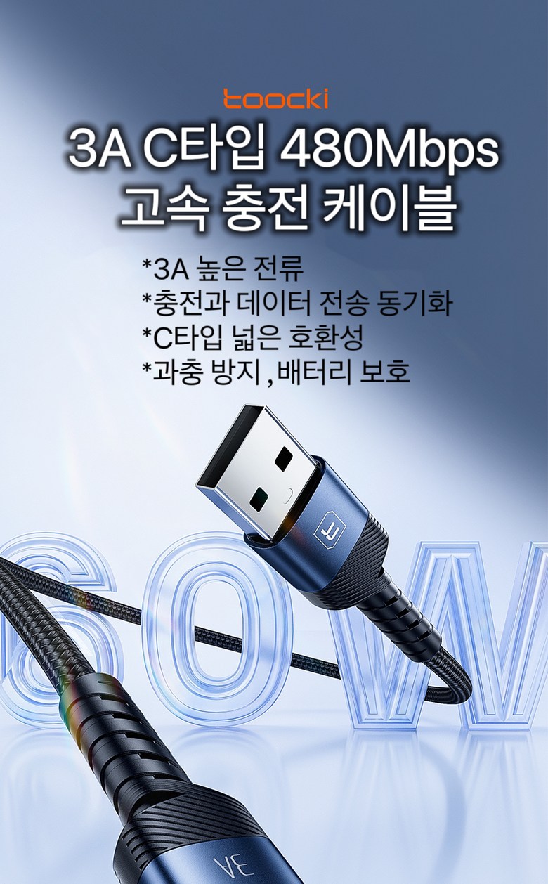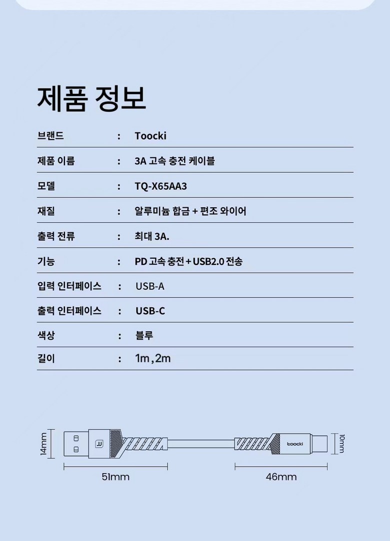 | 품명 및 모델명 | Toocki 3A USB-A TO USB-C 고속 충전+데이터 USB2.0 케이블 | KC 인증정보 | 상품 상세페이지 참조 |
