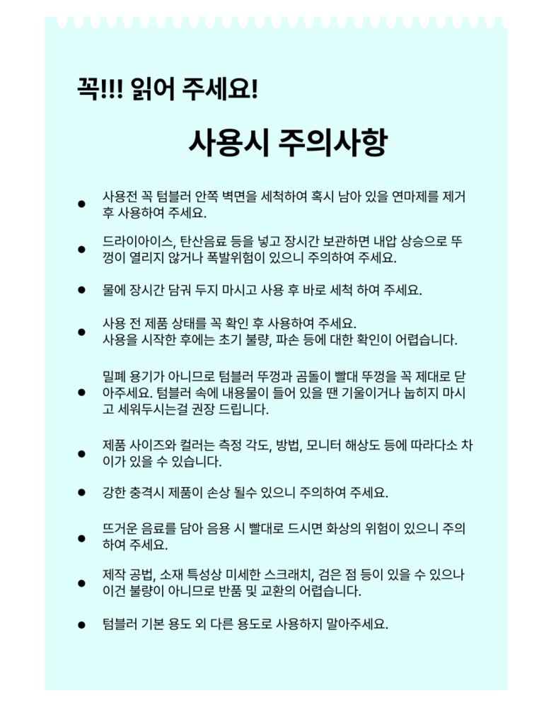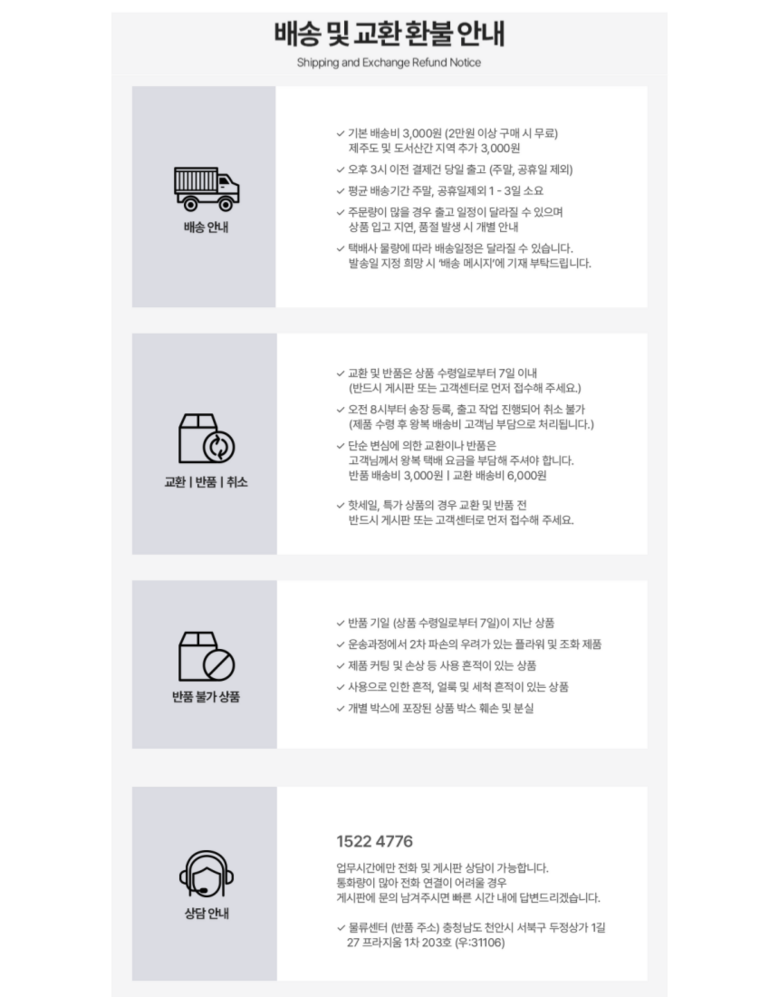 - ㆍ모니터 해상도의 차이로 인해 색상이나 이미지가 실제와 달라, 고객이 단순 변심으로 교환/반품을 무료로 요청하는 경우