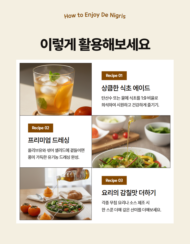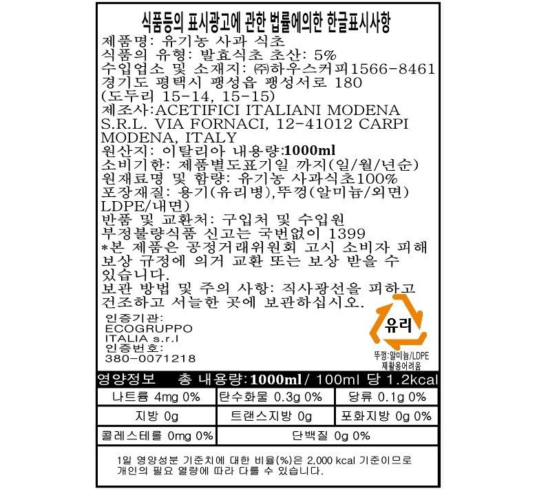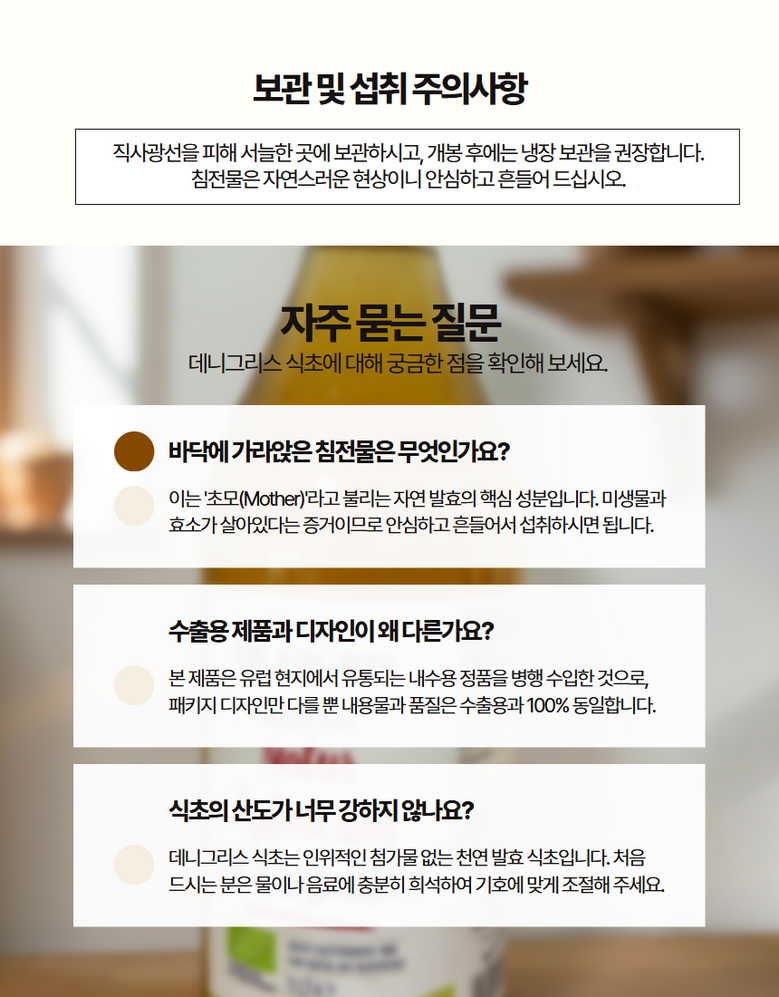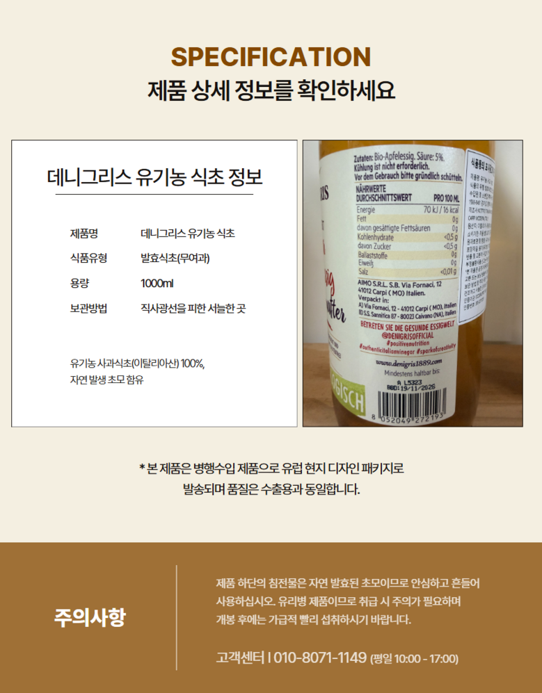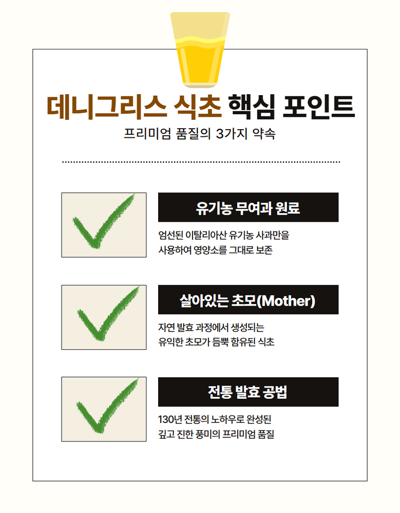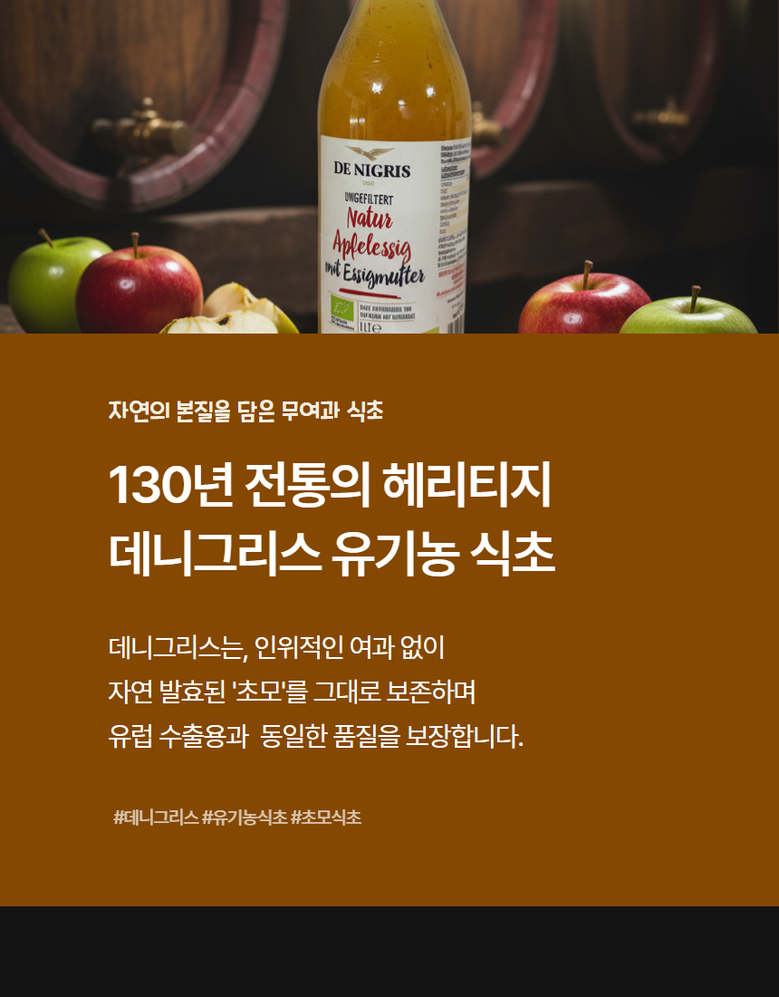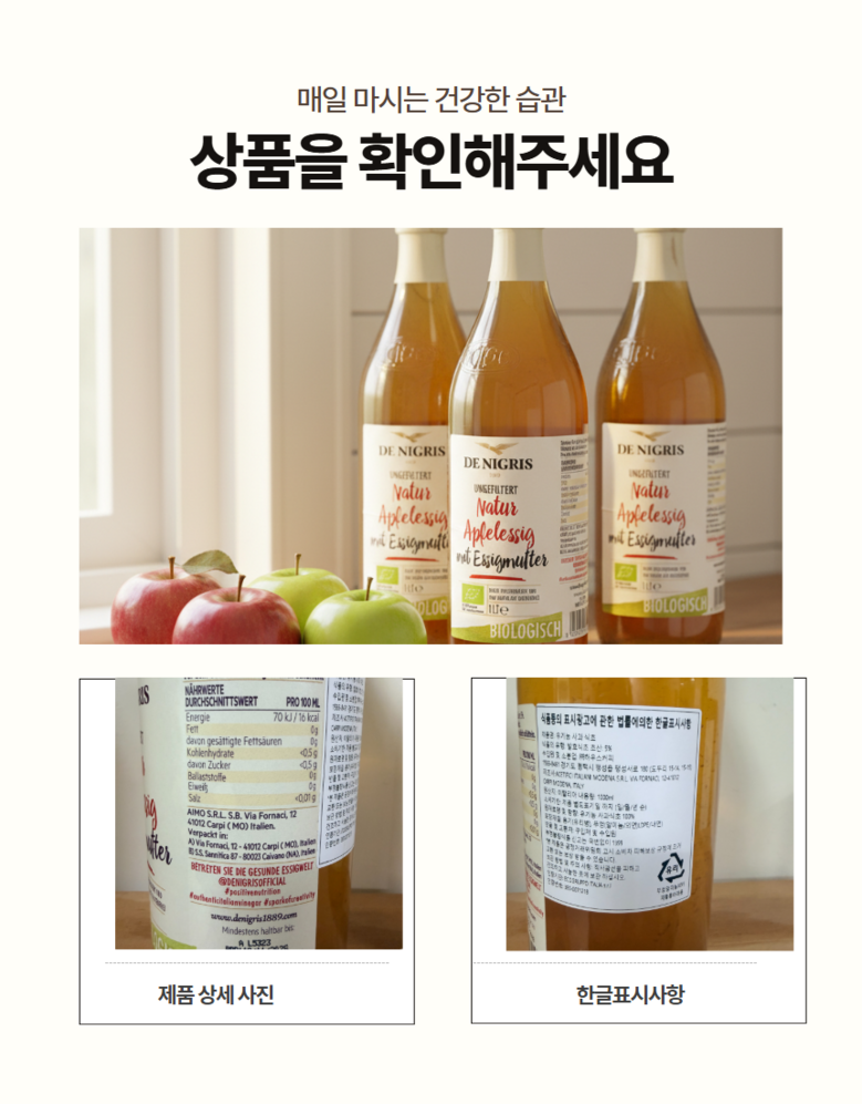 수출용 상품과 패키지 디자인, 언어, 문구가 다르지만, 데니그리스 정품 유기농 사과식초입니다.