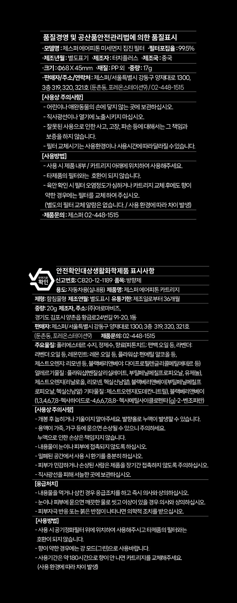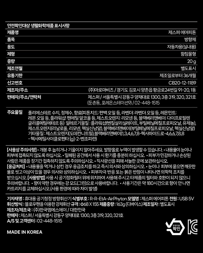 | 품명 및 모델명 | 제스퍼 에어피톤 차량용 전자 디퓨저 | 동일모델 출시년월 | 2019년 4월 |