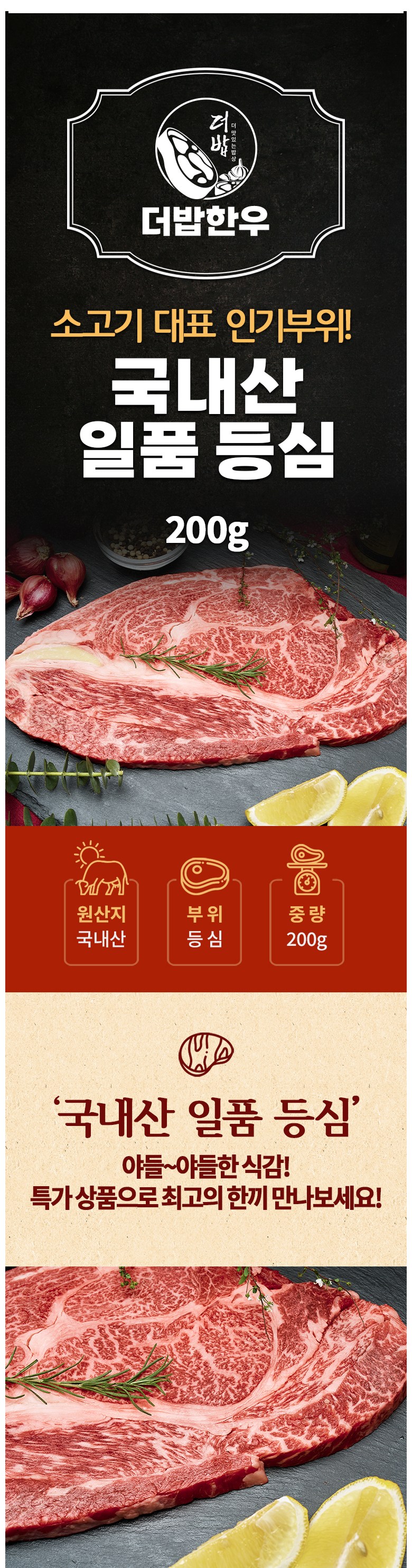 | 품목 또는 명칭 | 육즙가득 미친 마블링의 향연! 국내산 육우 일품 등심 소고기 스테이크 구이 200g | 포장단위별 내용물의 용량(중량),수량,크기 | 소고기 구이 육즙가득 마블링 스테이크 국내산 육우 일품 등심 200g |