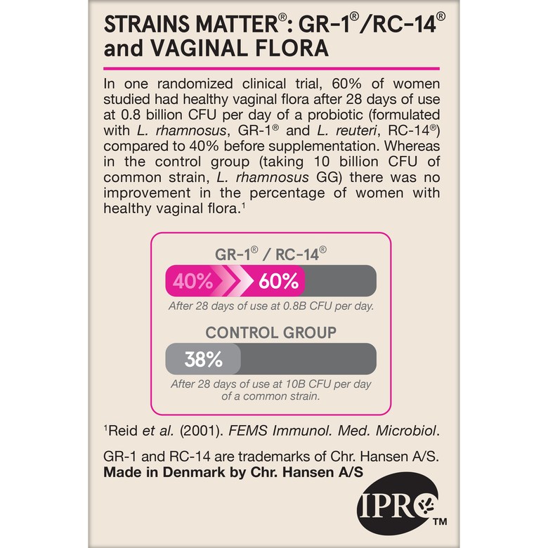 여성용 유산균입니다. 락토바실러스 람노서스(Lactobacillus rhamnosus) GR-1 및 락토바실러스 류테리(Lactobacillus reuteri) RC-14를 함유하고 있습니다. 특수 제조된 캡슐 제형으로 위산으로부터 안전하여 보호하여 장까지 전달해줍니다.