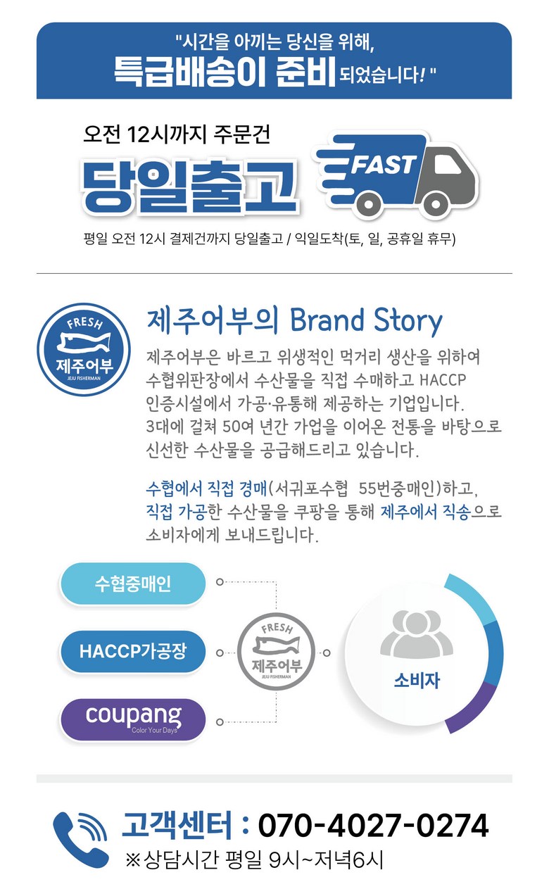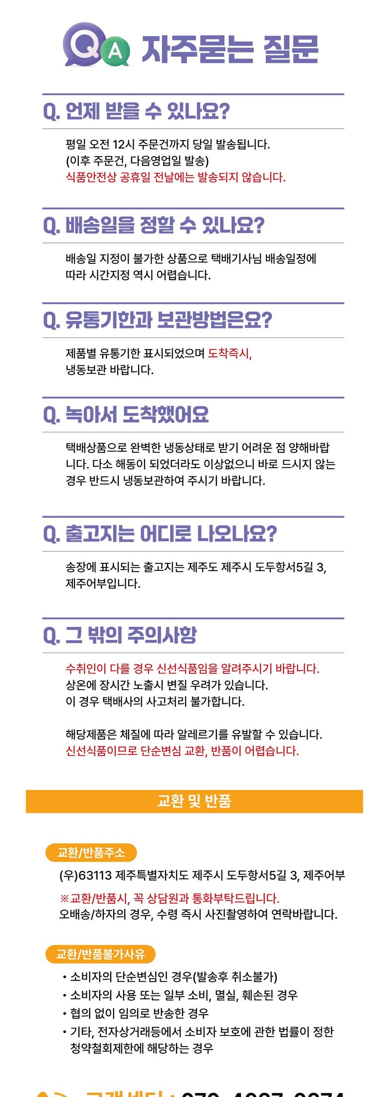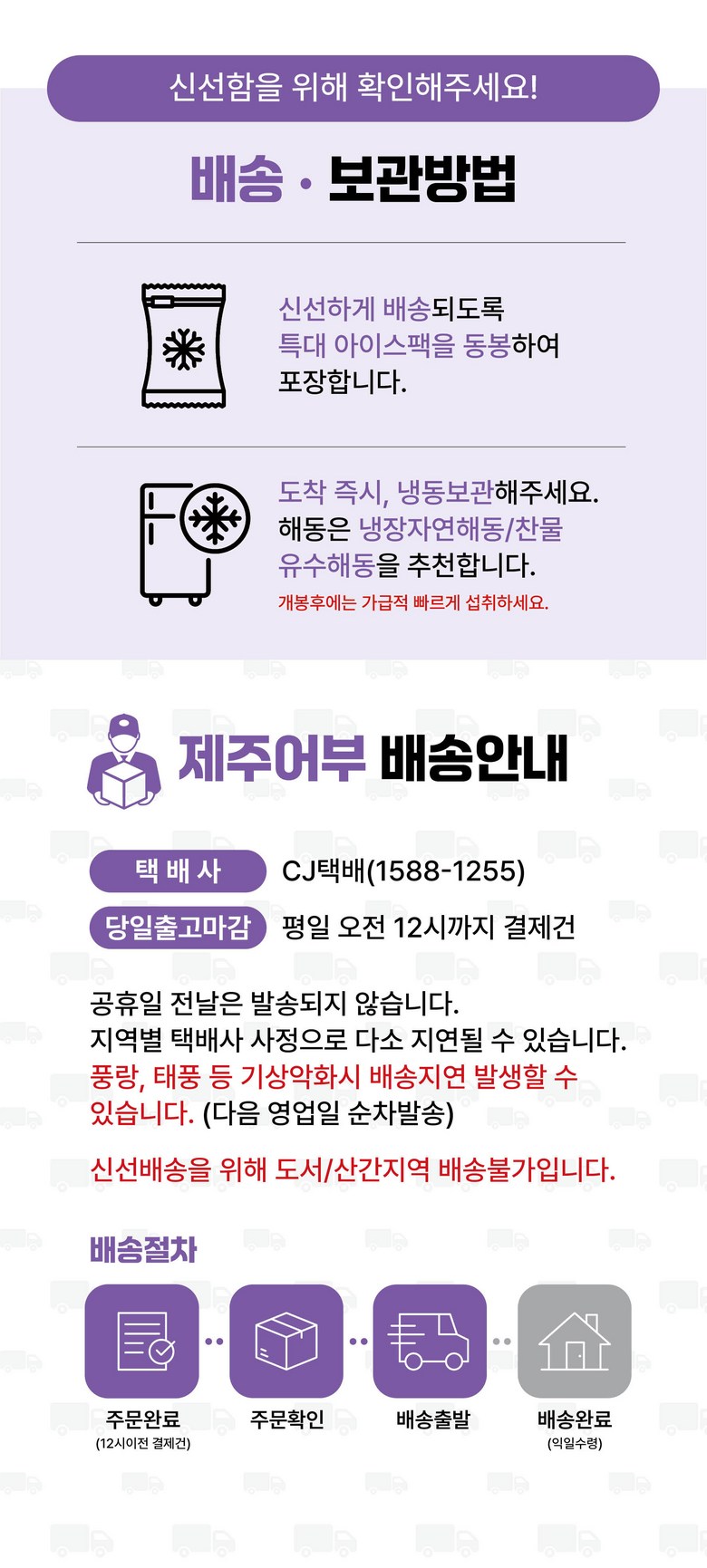 | 배송방법 | 신선/냉장/냉동 | 배송비 | 4,500원 - 50,000원 이상 구매 시 무료배송 - 도서산간 지역 배송불가 |